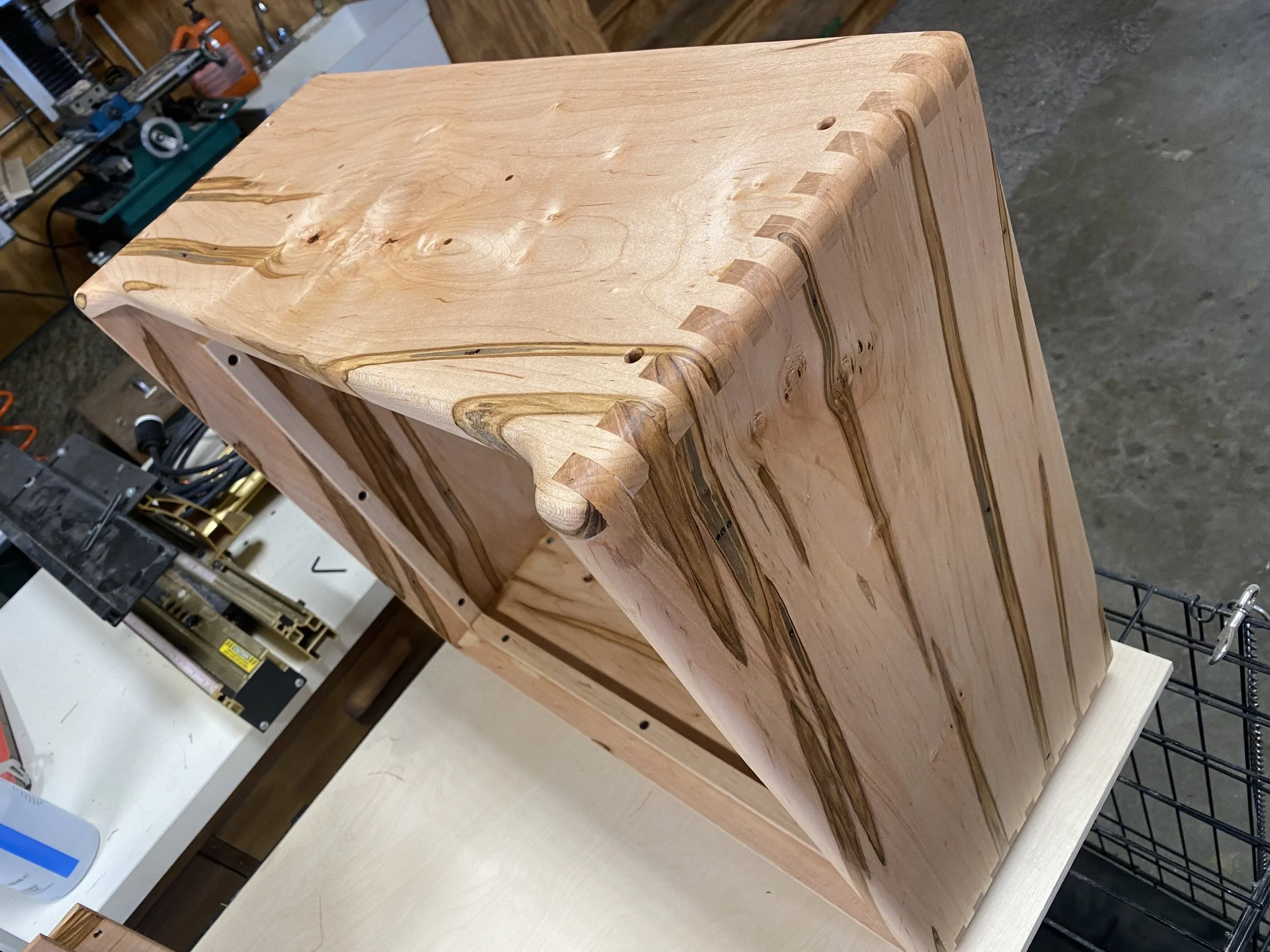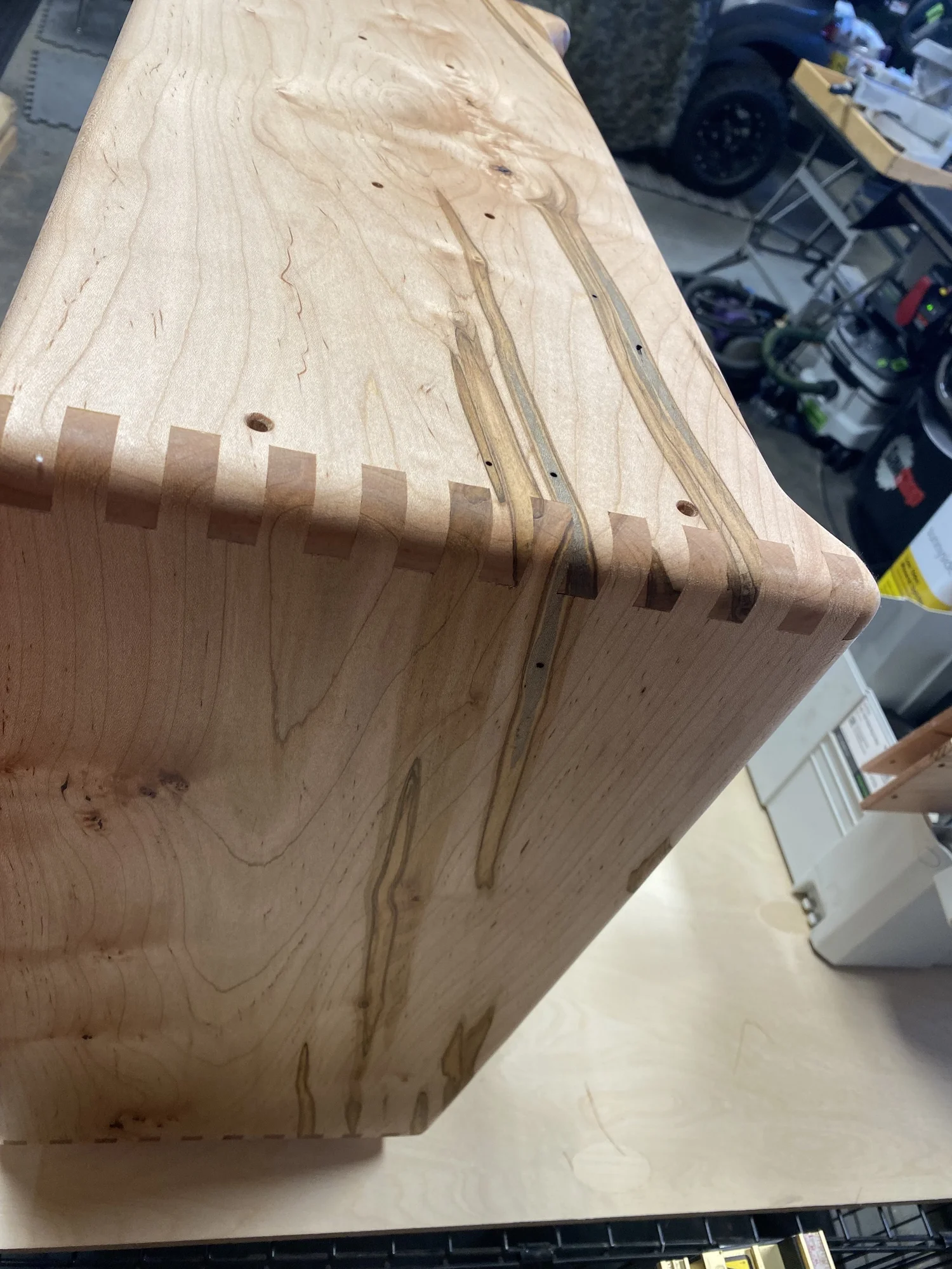 So I am getting close to finishing a cab I am doing in Ambrosia Maple.  This a really great wood that I have never built with until now.  What I noticed too was when I rubbed a little alcohol on it to see the grain it turned kind of a reddish tint!  I will do the finish in oil (Rubio Monocoat).  Some of you wood geeks probably already know all about this stuff :)