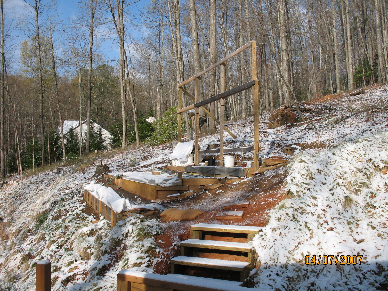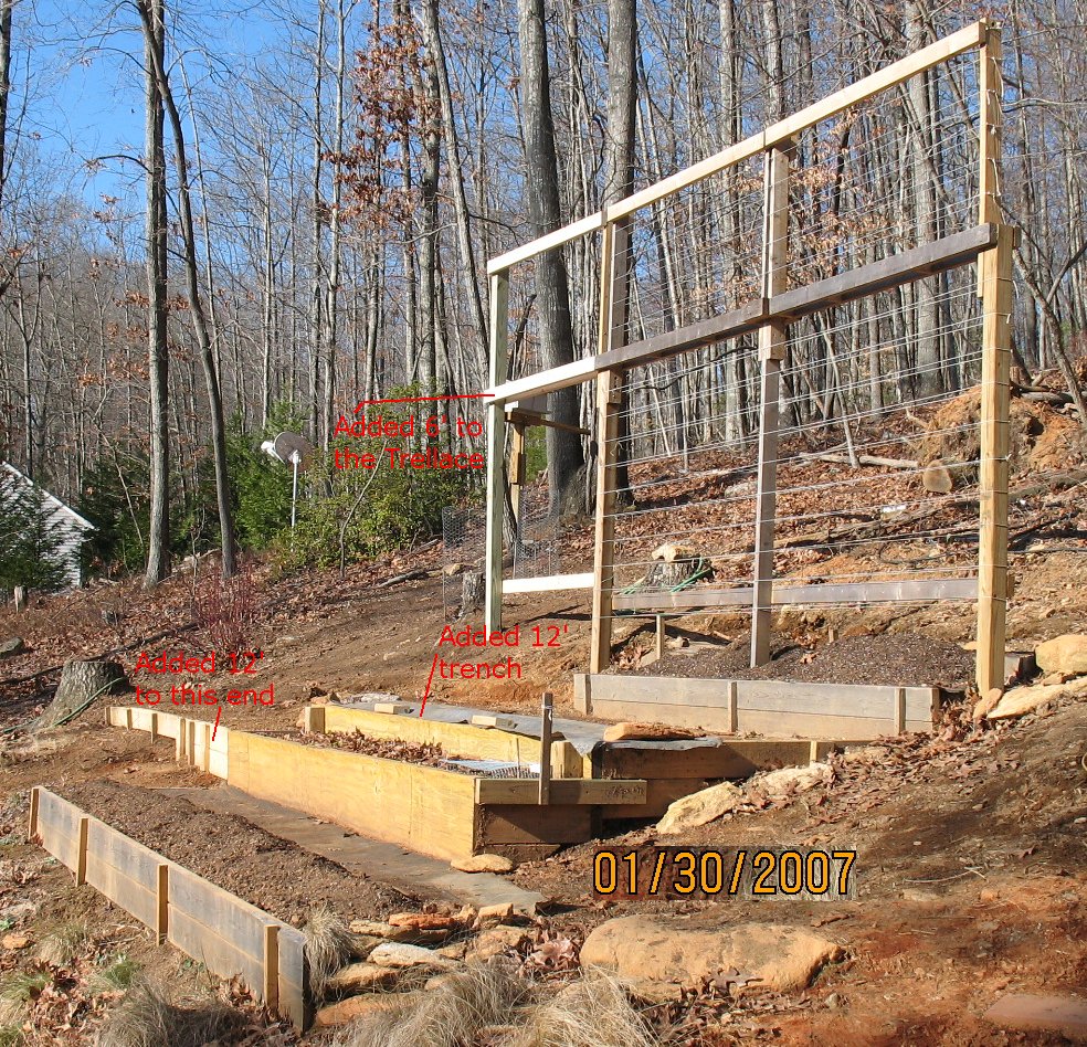 January 30th 2007- looking mighty bare I added another 12 foot section at the end of the second tier for more buckets. I added another 12 foot trench for in the ground planting on tier 3 for lettuce, spinach, etc. I added 6 feet more to my back line trellis. |