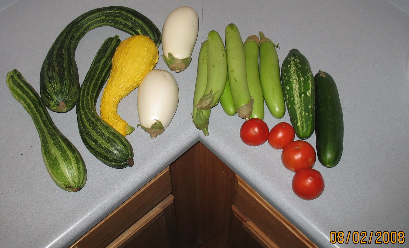 Pictures of some of 2008's harvest. Those long green eggplants turned out to be a favorite. We like the green, the lavender and the white eggplants way better than the big purple eggplants. They have more of a dense mushroom type texture than the big eggplants do. |