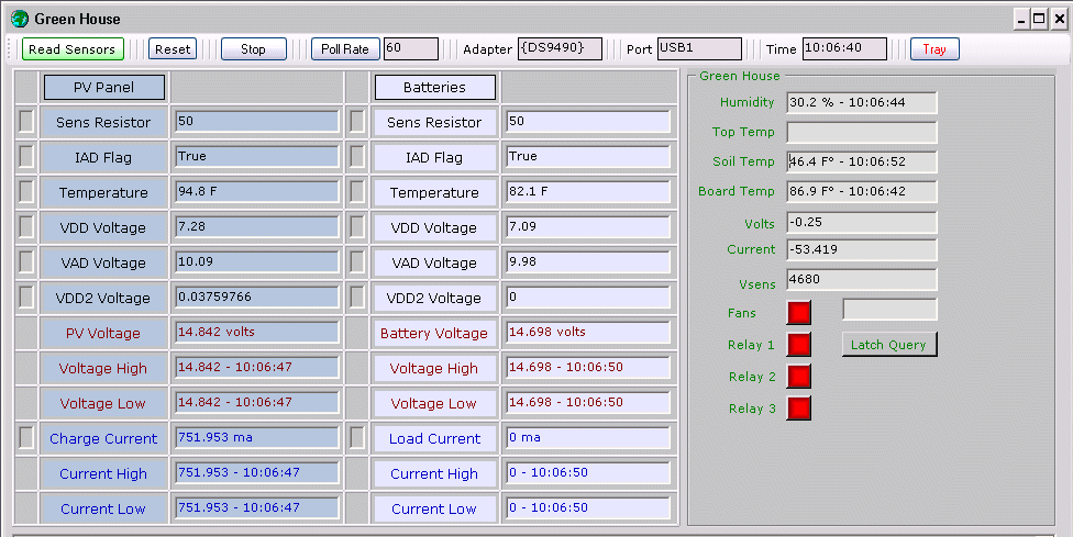 I have since added some electronic controls to my green house. I wrote some software that monitors the green house. The computer monitors and controls all the green house functions. I can monitor the temperature, humidity and light levels inside the green house. If it gets too hot, several small 12 volt fans turn on and exhaust the hot air to keep the temperature from getting too hot. I also added a 12 volt solar panel and battery storage outside the green house. The fans and all the controls run on solar. The screen shot above shows all the functions I monitor, including the solar batteries and solar panel. | |