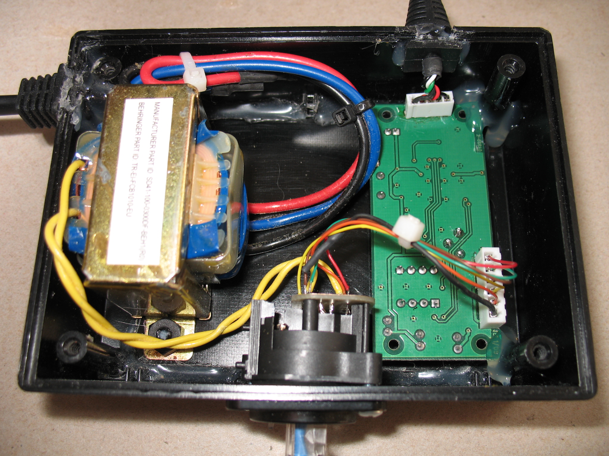 Full view of the insides of a FCB1010 The power transformer is on the upper left There are two yellow wires that leave the power transformer and go to some diodes The diodes rectify the 10 volts AC into DC The Midi in and out jacks are on the upper right |
