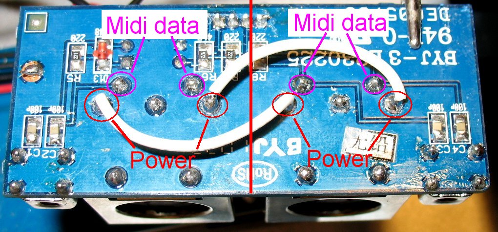 power I did this on the underside of the Midi jack board because it was easier than adding more wires to the back of the jacks The image above shows the underside of both Midi jacks The two inside connections on each Midi jack are Midi data The two outside connections on each Midi jack are used to supply 10 volts AC power |