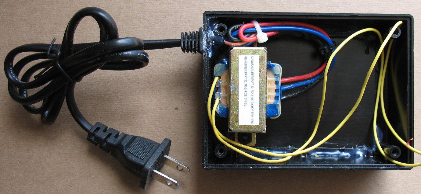 This page describes how I created an external power source for my two Behringer FCB1010 midi controllers The external black box that holds the power source also holds a USB Midi interface A stock FCB1010 has an AC power cord that brings power into the FCB1010 You also need two midi cables to send and receive Midi data So that's 3 cables laying on the floor for one FCB1010 I have two FCB1010's and so that is 4 cables total on the floor You can put the two FCB1010's in Midi series with a short Midi cable The FCB1010 internal power transformer creates 10 volts AC from a wall socket source It is possible to bring 10 Volts AC into the FCB1010 from an external power source and not use a AC power cord If you only have one FCB1010 you could use two wires inside a midi cable to bring in that power In a Midi cable there are typically 4 wires Only two of those wires are used for Midi signals So you can use the other two wires to bring power into the FCB1010 This is what many people do and you can find several of those projects on the web The way I am doing it is by bringing the 10 Volts AC via a CAT 5 network cable The reason I am using CAT 5 cable is that it has 8 wires I have two FCB1010's so that requires that I have 4 Midi data wires So that leaves 4 wires free to use for power I only need two wires for power but it is a good idea to combine two wires to get a larger current capacity The four extra CAT5 wires are joined together to make two pairs of wires And since the power I am sending down the CAT5 cable is AC, I used two twisted pairs to send 10 volts AC Twisted pairs of wires cancel out hum and so I am just being cautious CAT5 network cable has 4 twisted pairs of wires inside And since I have two FCB1010's, I am going to remove one of the power transformers in one of the FCB1010's This power transformer will be used to power both FCB1010's in my external power box The power transformers in FCB1010's are beefy enough to supply power to two FCB1010's The power transformer will be mounted in an external box next to all my gear A single CAT5 cable will come from the box near my computer and sound gear to the FCB1010's That's it, just a single CAT5 cable on the floor I am also adding a USB to Midi interface inside my FCB1010 power box The power box will have a USB cable that will go to the computer The USB Midi adapter wires will go to a RJ45 jack The RJ45 jack will send and receive Midi info to and from the FCB1010's So my power box not only makes 10 volts AC for the FCB1010's, it also sends and receives Midi data from the computer to the FCB1010's Everything is in one small box The image below shows just how clean my dual FCB1010 setup is now |