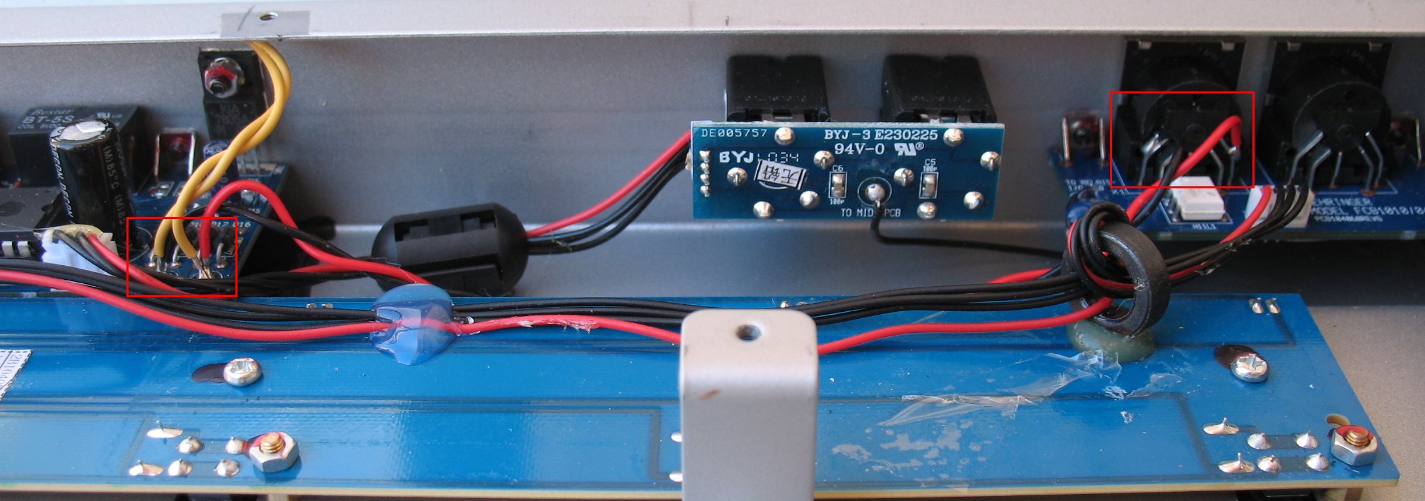 This is the #2 stock FCB1010 that will get power from the 1st FCB1010 The 10 volts AC comes in through a Midi jack and then goes to the diodes The red boxes on the images show the connection points If you look at the image above left you can see which to pins I am using on the Midi jack Note that since this is AC, the wire connections do not matter I only used red and black wire because that is what I had one hand This is also how you would mod a single FCB1010 to use external power I describe how to do that below ![]() Single FCB1010 power mod If you had only one FCB1010 and you wanted to bring in external power, this is how you would do it You would use two wires inside a Midi cable to bring in the 10 volts AC You use the two outside pins on the midi in jack The other two pins are the Midi signal Ignore the center pin, it is a ground pin that provides ground to the shield on the Midi cable If you are going to use an external power source full time, I would unsolder and heat shrink the two yellow wires that go from the diodes to the power transformer Just leave the yellow wires coiled up and out of the way so you can easily convert the FCB1010 back to stock See the image further up this page showing the yellow wires clipped and heat shrinked You can remove the existing power transformer and use it in your external power supply or you can leave the stock power transformer in place and find a suitable power transformer that produces 10 volts AC |