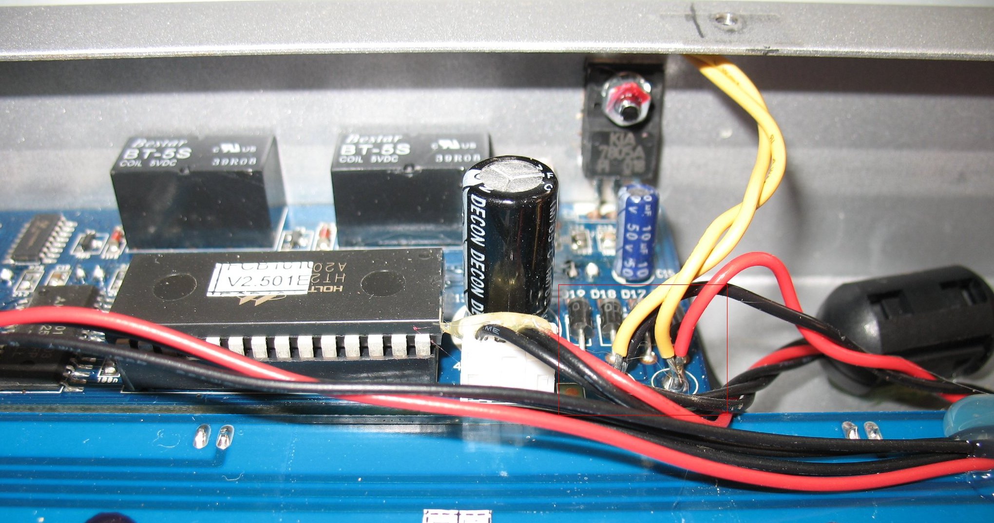 Left: In a stock FCB1010, the yellow wires from the power transformer go to 4 diodes. The diodes rectify 10 volts AC into DC Note that in this image I have added a red and black wire that are not part of a stock FCB1010. The red and black wires are going to bring 10 volts AC to the diodes from an RJ45 jack I will add another red and black wire so that I can send 10 volts AC to my second FCB1010 through a MIDI jack The 2nd FCB1010 does not have to have a power jack because I can use two of the Midi cable wires Only one of my FCB1010's will have a RJ45 input jack |