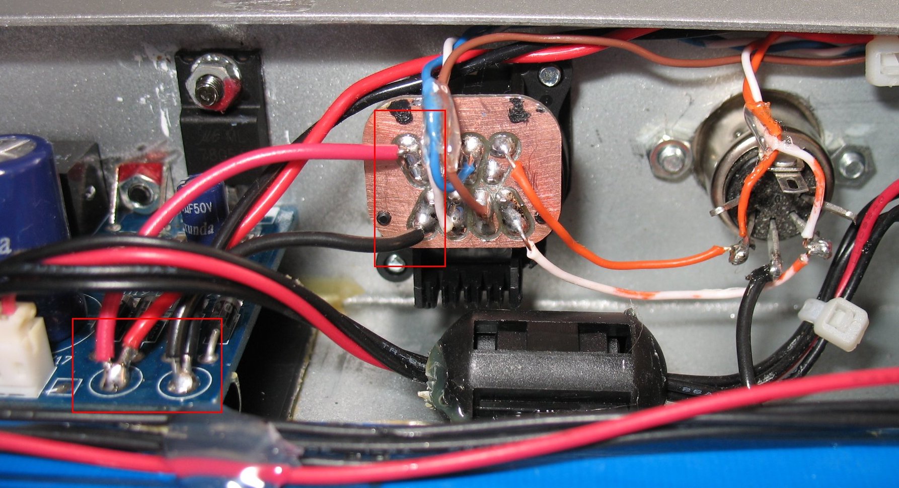 This is the FCB1010 that has the RJ45 input jack The back of the RJ45 jack is shown in the center It has a small copper PC board on it so you can make solder connections to the 8 wires I have added a second pair of red and black wires to the diodes One red/black pair goes to the RJ45 jack The other red/black pair goes to the Midi in jack A Midi cable will then carry 10 volts AC to the 2nd FCB1010 Ignore the silver colored Midi jack to the right of the RJ45 with the two orange wires That is another experiment and is not part of my dual FCB1010 power mod |