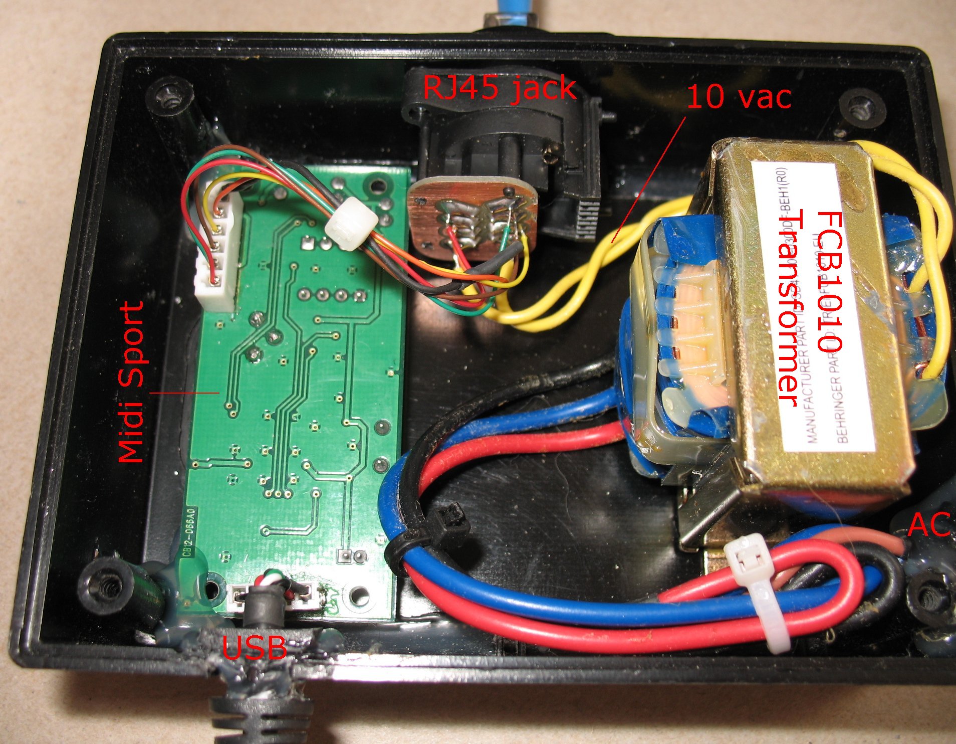 I dismantled a M-Audio USB Midi sport and mounted it in the box A USB cable enters the box and goes to the Midisport board The wires leaving the white connector on the USB Midisport go to the RJ45 jack to send and receive Midi from the FCB1010's So now this little black box does all this: It provides 10 volts AC to the FCB1010's via the RJ45 jack It sends and receives Midi in and Midi out data to the FCB1010's via the RJ45 jack It sends and receives Midi in and Midi out data to the computer through the USB cable |