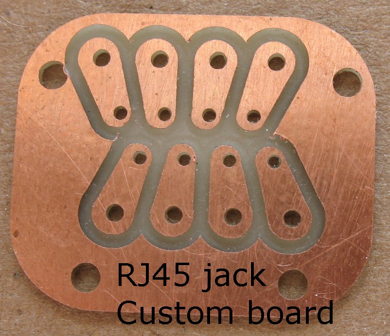 This image shows the custom RJ45 jack pc boards I made on my CNC machine There were only tiny pc board pins on the jack and so I had to have a way to solder wires to those tiny pins |