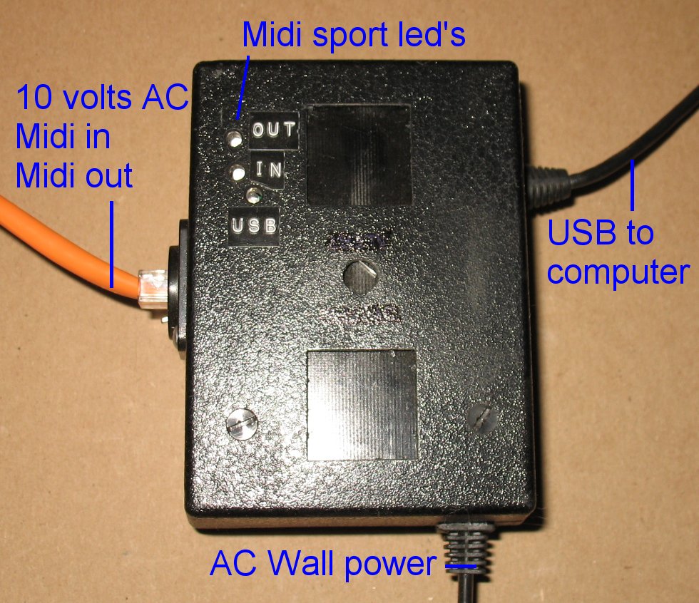 Here's the little black box It used to be a surge suppressor in it's previous life Note that I drilled 3 small holes so the LED's on the Midisport would be visible The USB LED is lit up when the Midisport is connected to the computer The in and out LED's light up when Midi data is being transmitted |