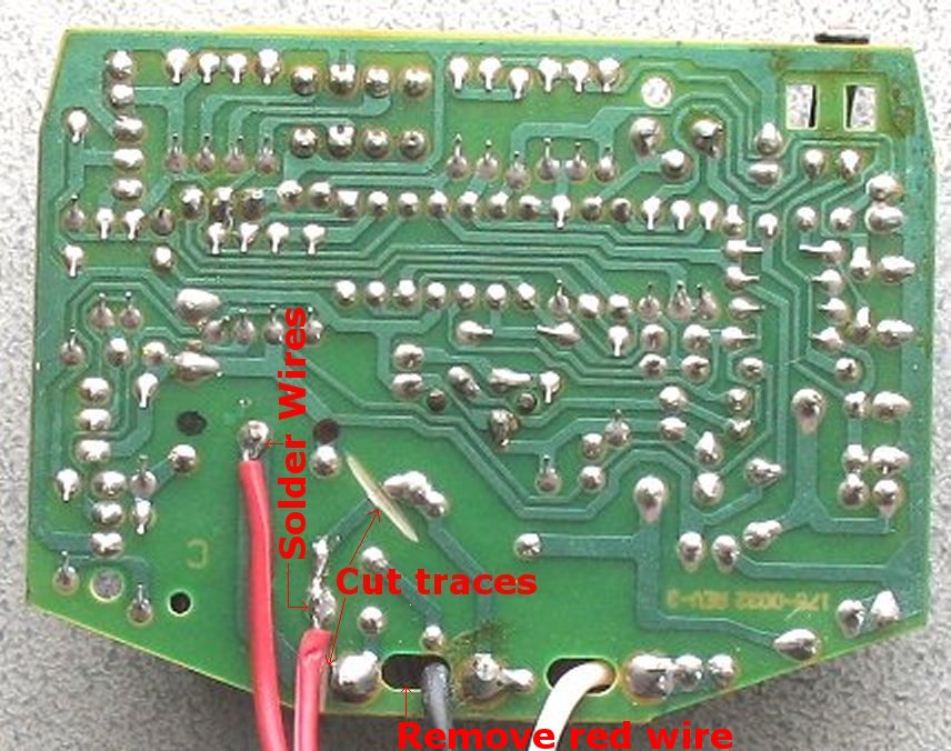 The photo above shows the underside of the relay. You can see where the relay coil and relay switch connections are. It also shows where to cut through two circuit board traces. This disconnects 120VAC from reaching the relay switch contacts. The red wire in this picture will be removed also. |