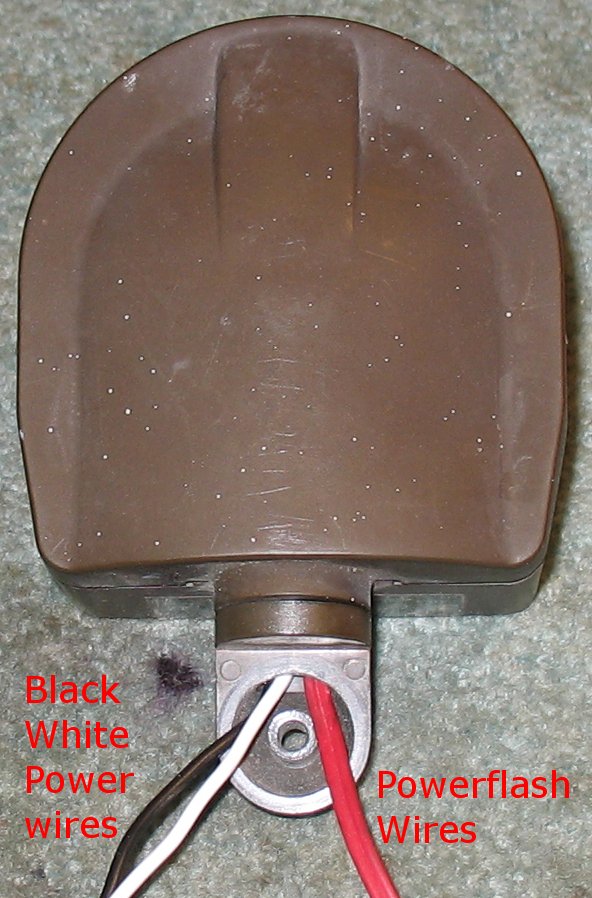 Here you can see the motion detector re-assembled. The black and white are the power wires that get connected to 120VAC. The double red wires are the wires that get connected to the Powerflash unit. If you want to use the motion detector without spot lights, you will have to add a simple lamp cord/power cord to power the motion detector. If you want to re-attach the motion detector to the spot light assembly you will have to have the power flash near the spot lights or have a very long set of Powerflash wires. The spot lights could then be powered off and on when the Powerflash unit is triggered. The Powerflash unit can then trigger an X10 wall switch or appliance module that can then turn on the spot lights. All sort of possibilities are possible once the Powerflash unit is triggered. |