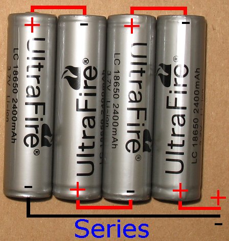 The batteries pictured below are 18650 - 3.7volt Lithium Ion's at 2400 mah hours each Batteries in series The voltage adds together for each battery in series.. The mah (milliamp hours) or current capacity is the same as one of the cells. Batteries in Parallel The voltage total is the same as each individual battery. The mah (milliamp hours) or current capacity is the total of each battery in the battery pack. Batteries in Series/Parallel Assemble the Series sets first: The voltage adds together for each battery in series. The mah (milliamp hours) or current capacity is the same as one of the cells in the series set. Series sets are then put into Parallel with each other: The voltage is the same as each series set. The mah (milliamp hours) or current capacity is the total of each series set. |