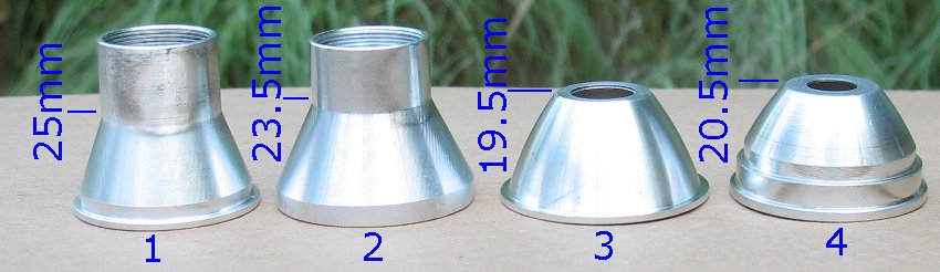 Reflector sizes Note that reflectors 1 and 2 in the lights above have the rear threaded area machined off and the hole enlarged for a P7. Reflectors 1 and 2 shown here are new, unmodified reflectors. You can see how the reflectors are machined on this page. |