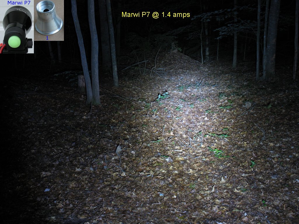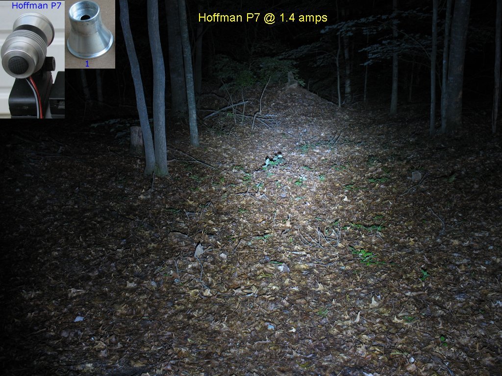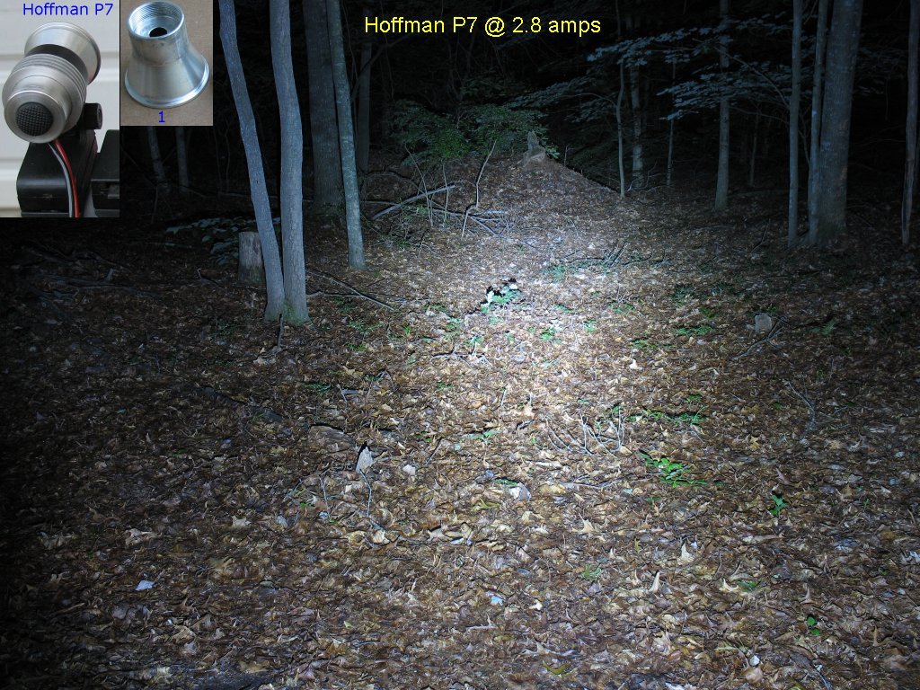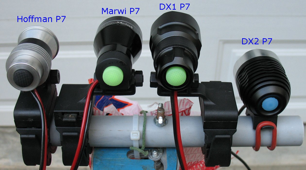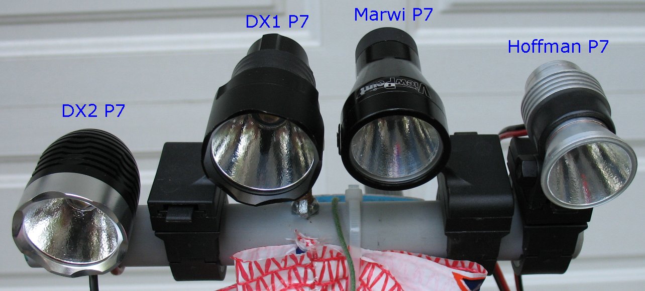 Here's the beam shot line up. The Marwi P7 is a halogen conversion - More info here on this light The DX1 P7 is flashlight conversion with the 1.4 amp/2.8 amp/Clicky switch mod - More info here on this light The Hoffman P7 is a one-off home brew of mine that was too expensive to have made in a machine shop The DX2 P7 is Deal extreme SKU 25149 P7 bike light. - More info here on this light I had not taken actual current measurements on this light yet, so I didn't know the actual current settings for High and Low The 1.4 amp/2.8 amp/Clicky switch mod is explained on this page |