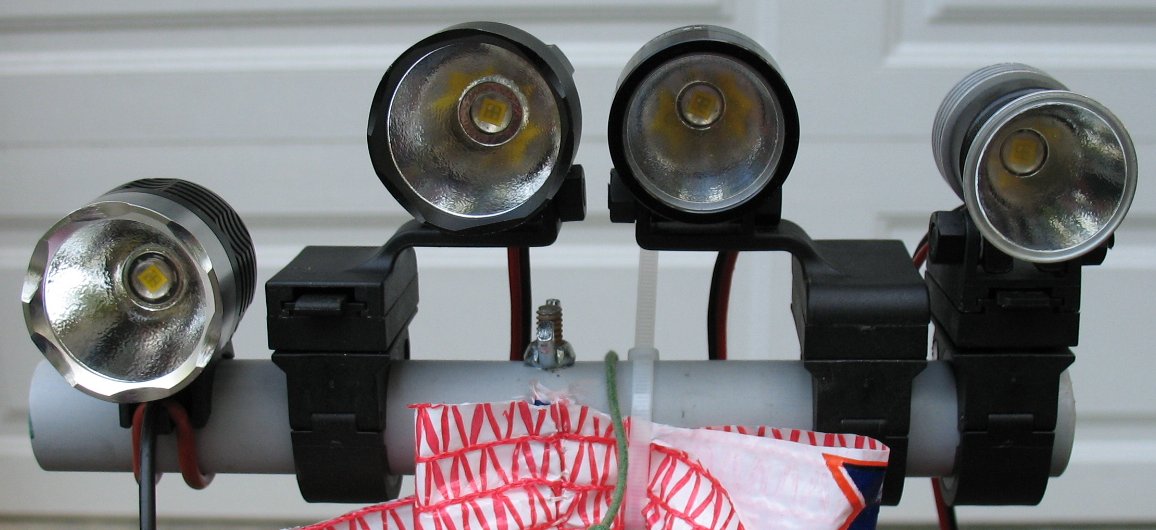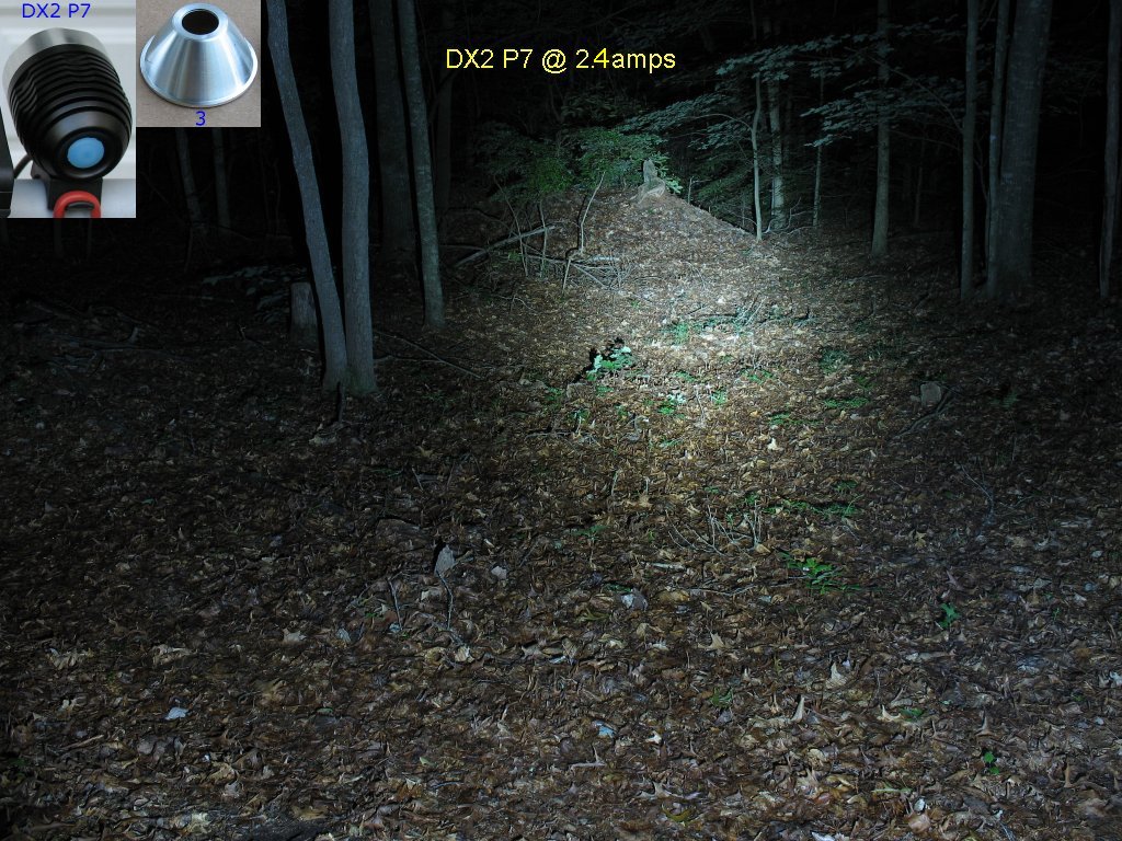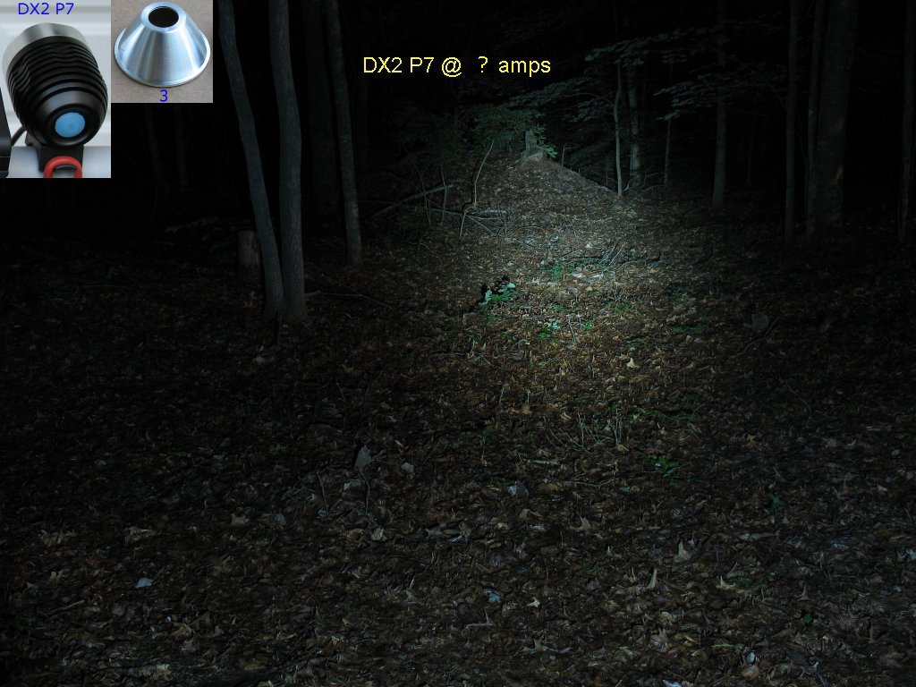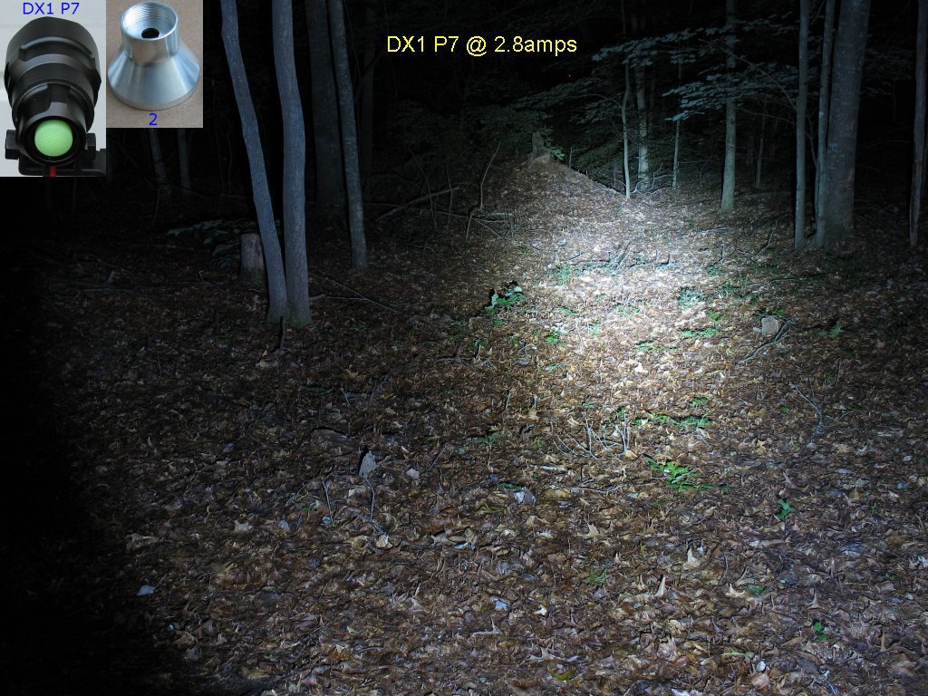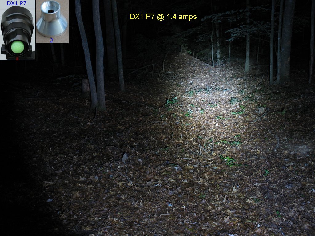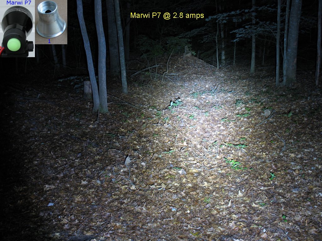 Here's the beam shot line up. The Marwi P7 is a halogen conversion - More info here on this light The DX1 P7 is flashlight conversion with the 1.4 amp/2.8 amp/Clicky switch mod - More info here on this light The Hoffman P7 is a one-off home brew of mine that was too expensive to have made in a machine shop The DX2 P7 is Deal extreme SKU 25149 P7 bike light. - More info here on this light I had not taken actual current measurements on this light yet, so I didn't know the actual current settings for High and Low The 1.4 amp/2.8 amp/Clicky switch mod is explained on this page |