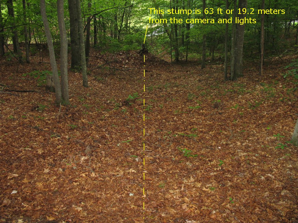 Here's a day time shot of the test area. The stump on top of the hill is 63 feet or 19.2 meters from the camera and the lights You can see the stump in the beam shots below |