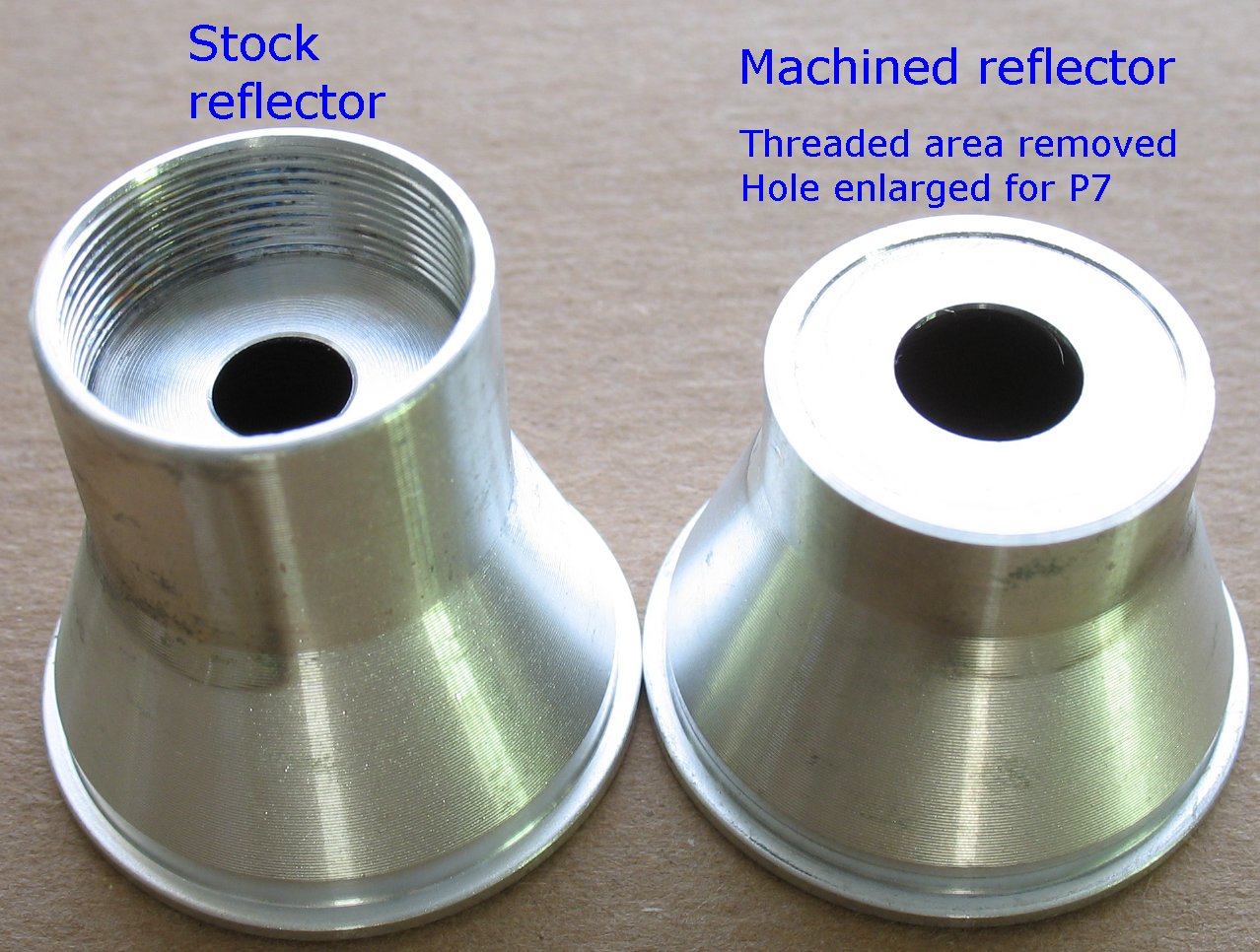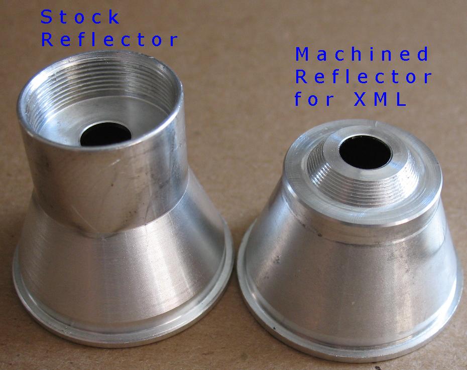 ![]() This is the heat sink I use for the XML LED ![]() On the right is a XML reflector after it has been machined The page below has tons of pics and info on how I convert these lights The current build instructions for this light are on this page Info on the multi mode driver board I use in these lights can be found on this page |