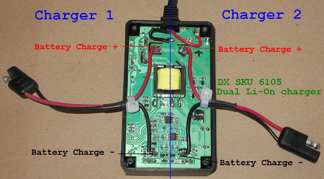 I soldered a connector to the plus and minus of each charger and then the connectors exit the charger on each side so that I can tell which connector goes to which charger. |