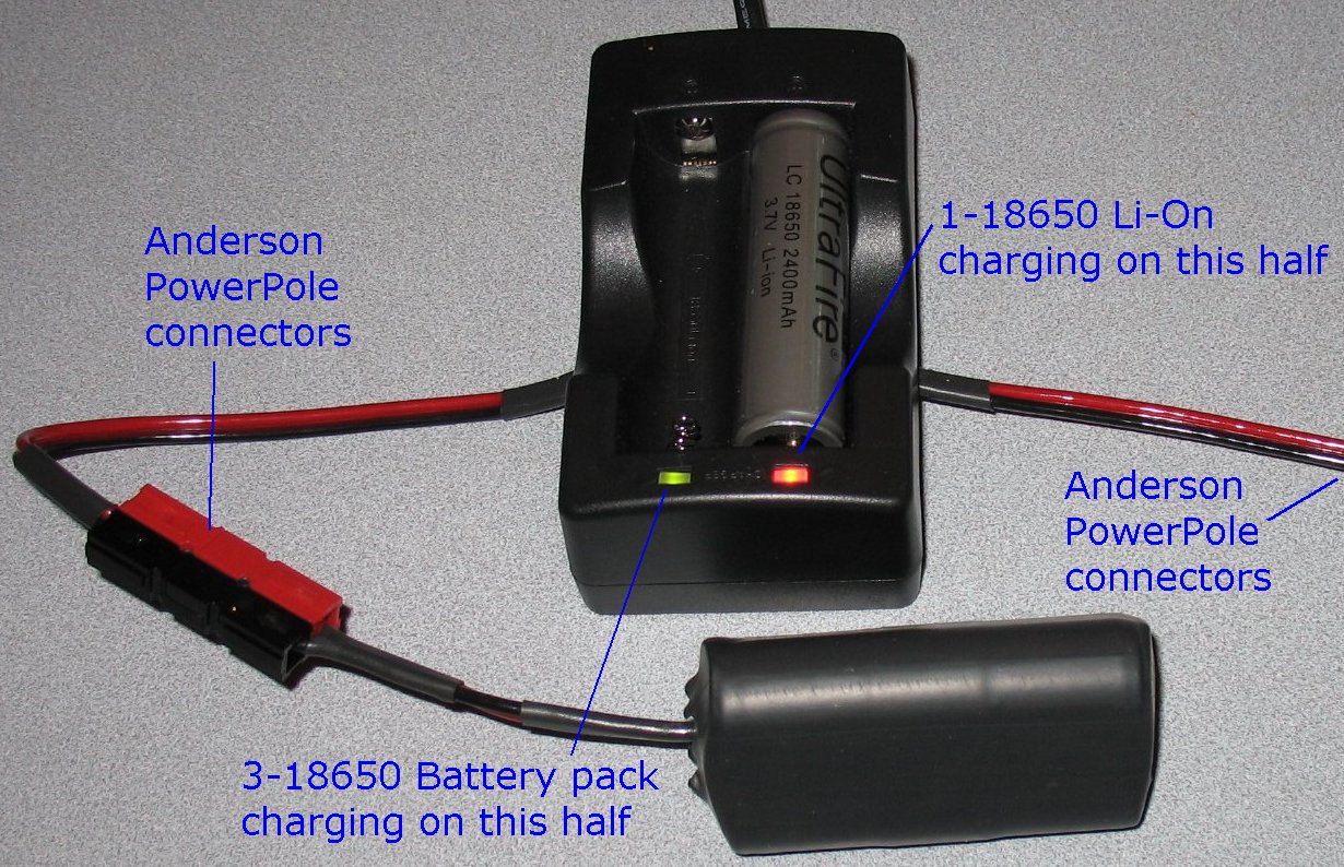I am charging a single 18650 3.6 volt 2400ma battery on the right charger and a 3x18650 battery pack on the left charger.