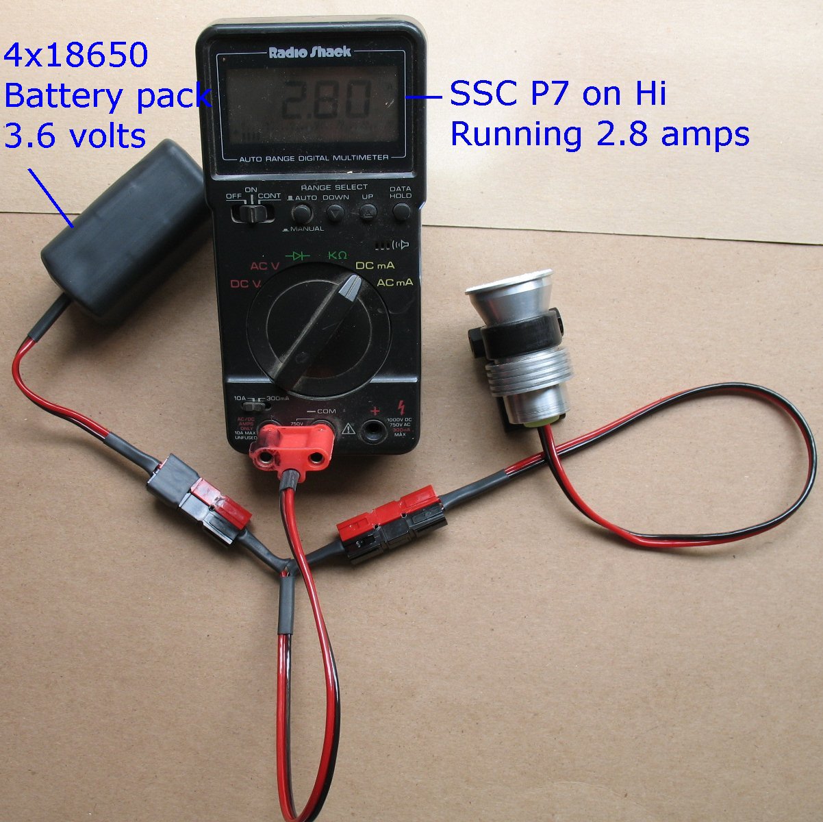 Here I am taking a reading with a SSC P7 LED light set on the High setting. The meter is reading 2.8 amps current draw |