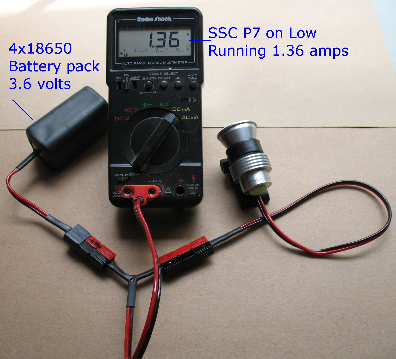 Here I am taking a reading with a SSC P7 LED light set on the low setting. The meter is reading 1.36 amps current draw |