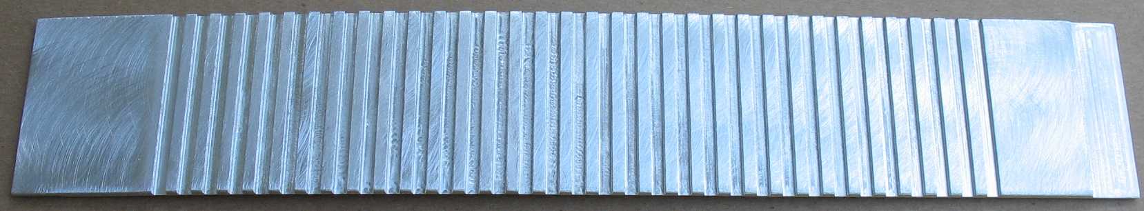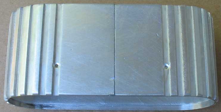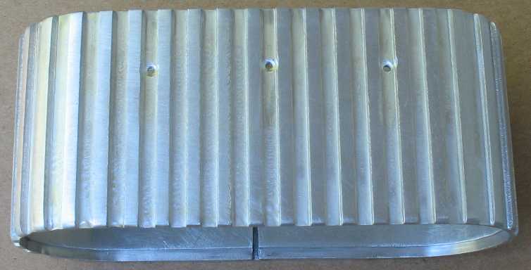The shell of the light started life as a flat piece of 6061 aluminum .125" thick x 10.25 inches long x 1.875 inches wide I milled the fins and other areas on my CNC machine There are half lap joints at each end The edges are milled so that the front lens and rear cover sit down into the body The idea was that if I milled the fins .062 inches deep, that was half the thickness of the metal. Being thinner, it would then be much easier to bend the flat piece into the final shape |