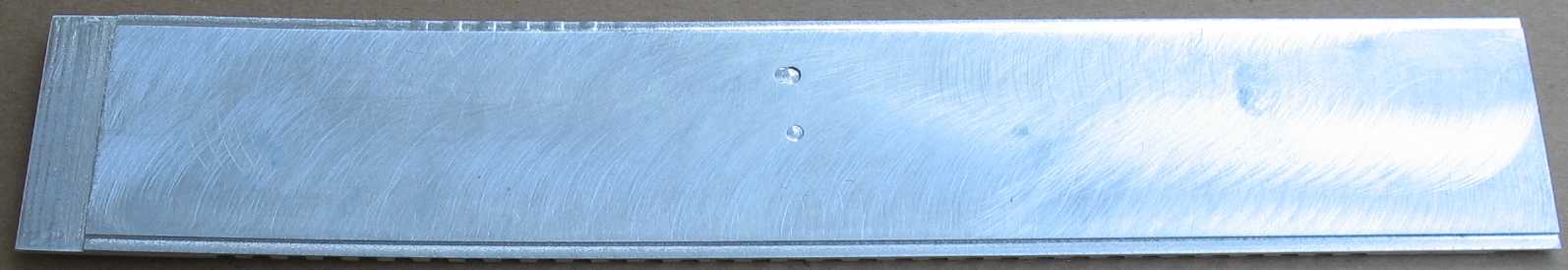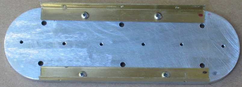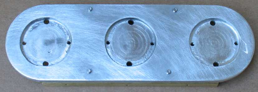 This is the P7 heat sink plate that sits inside the shell The 3 x P7 mounting areas are recessed .0625" into the heat sink plate All 6 P7 mounting screw holes are tapped for 1/72" stainless screws The larger holes are for the Teflon wires to pass through Note that the brass L strips were just for testing purposes I milled out some nice thick .375" x .375" Aluminum brackets later You can see the L brackets further down the page |