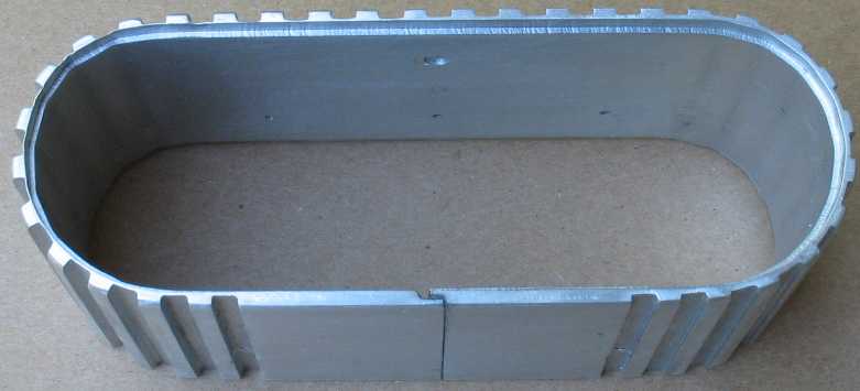 Here's the side view and top view of the shell after it was bent This was actually a lot harder to bend than I thought it would be I had to take a torch and heat the metal to get it to bend properly. It was only .062 inches thick at the bottom of the fins, but it did not want to bend very easily |