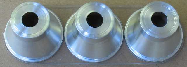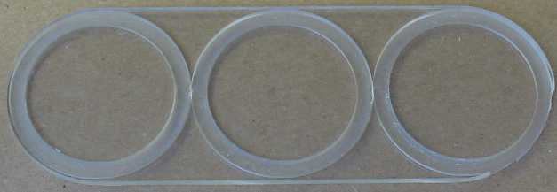 The front lens is .09" Lexan The 3 circles are milled .04" deep so that the reflector rims sit down inside the lens and stay put The shot on the right shows the 3 reflectors sitting down inside the lens The reflectors were glued and sealed into the Lexan circles using some clear high temp RTV silicon The whole lens was glued and sealed into the outer shell using the same RTV silicon The front lens gets sealed to the body to keep out moisture |