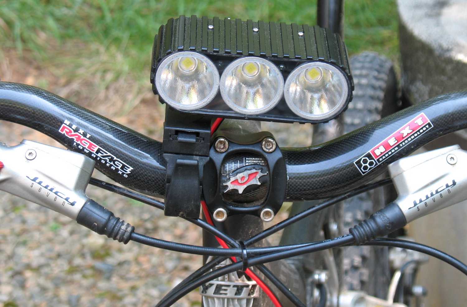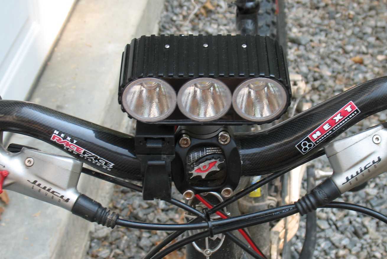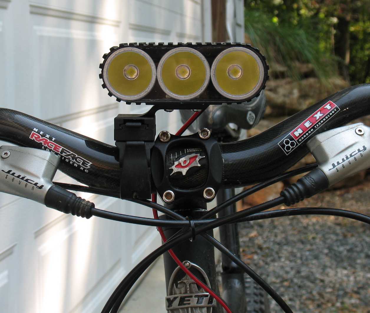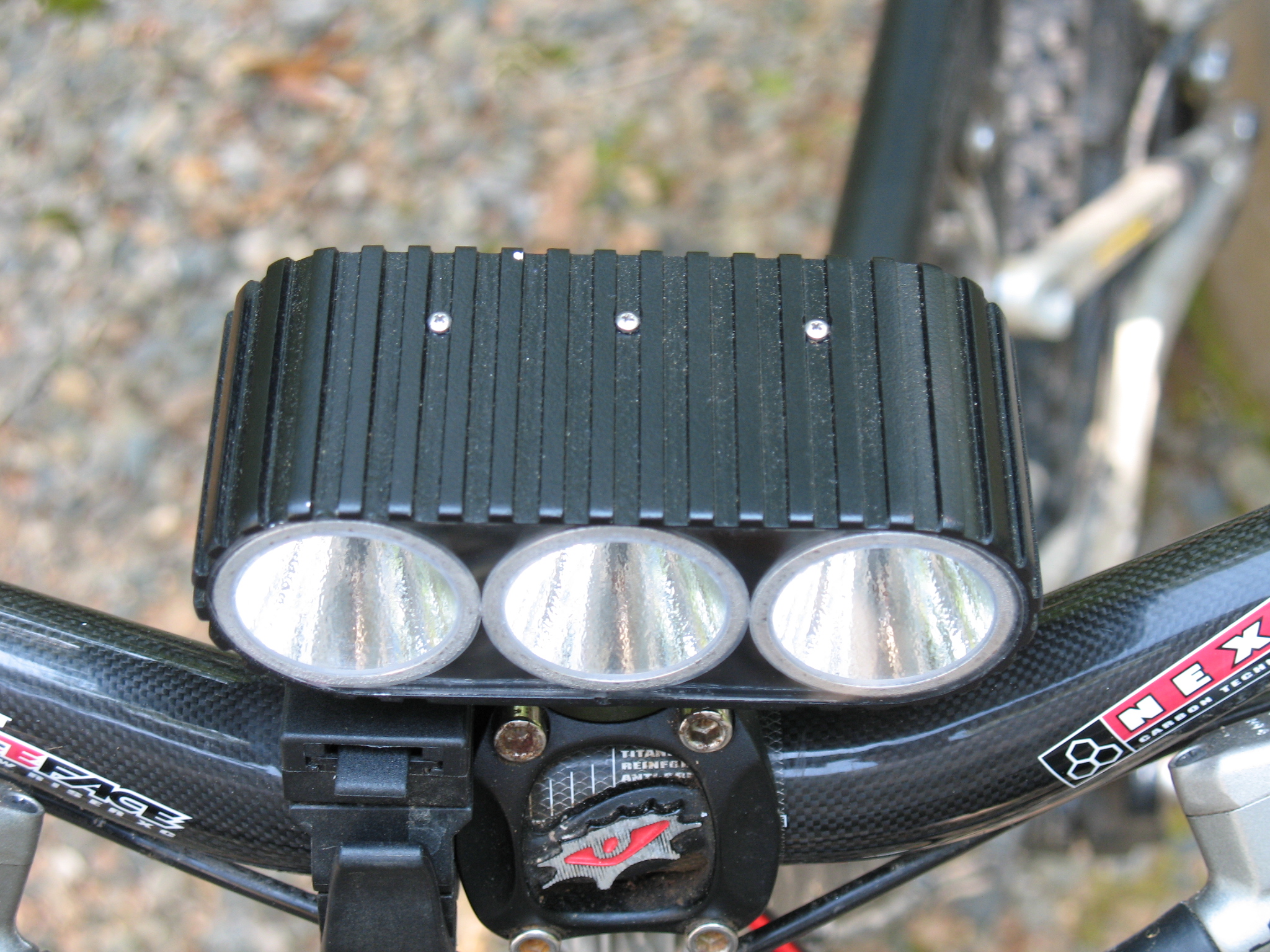 ![]() This is my Triple SSC P7 experiment I decided to give it a go because I thought about it and it seemed like it would be a fun project. Normally I only like little small round lights, but I think I can get used to this after seeing how bright it is. I only plan on using this light on the fast mountain descents here in NC, USA The light only gets turned on at the top of the climbs and off at the bottom I use a single Marwi P7 on my helmet set to low for all the climbs I don't much light for long mountain climbs I need as much light as I can get for the descents. I was using two of the Marwi P7's on my bars, and I only used them when I descended I don't need multiple light output settings for how I use my handle bar lights. This thing only gets turned on when I need tons of light I experimented with using a fancy switch and 6 of the 1400ma 7135 chip current limiter boards It ended up being way too complicated and I was not able to get any where near the 8400 milliamps total current that I would like to get So I got rid of all the electronics and hot wired all 3 P7's direct to a 3.6 volt 6x18650 battery pack The current topped out at 7500 milliamps which is 2500 milliamps per P7 That amount of current is just fine for each P7 Without any current regulation, the direct drive works just fine. I plan on running it on a 3.6 volt 6 x 18650 14,400 mah battery pack I already have The switch is a simple SPST 14amp Judco switch as used on the old Marwi halogen lights It's basically just Off and On The light weighs 241 grams, which is lighter than 3 of my Marwi P7's lights Beam shots of my Triple P7 light Wait for the animation to load and then it will play in a loop Beam shot animation |