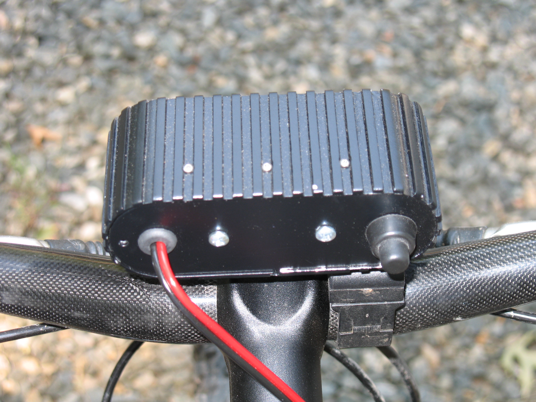 Jump way forward in the construction process I painted it black using 1200 degree barbeque grille paint. Not sure how well it will stick to bare aluminum, but it looks good right now. The mount is a Marwi offset mount that I modified The light sits nicely over the center of my stem and the Marwi offset mount is quite rigid The shot on the left shows the Aluminum L shaped heat sink brackets I made They are drilled and tapped with 1/72 stainless screws and screwed to the heat sink and the outer shell The L brackets have thermal paste against the heat sink wall and the outer shell The brackets sink the heat to the outer shell very nicely The shell gets hot very quickly which means the brackets are doing their jobs The back cover plate has two screw holes The screws go into some 6/32 Aluminum standoffs The standoffs are secured to the LED heat sink You can see the 14 amp Judco SPST switch with a rubber boot The wiring is simple and done with 20 gauge Teflon wire |