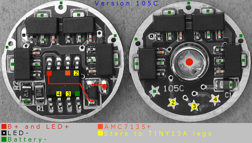 See the diagram above right that explains the different modes The stock board is already set to Mode 1, no stars are grounded You do not have to select a different mode if you want a strobe and SOS mode What appears to be Star #1 is just a Star that is connected to the outer ground ring If you want to select another mode, you have to ground one of the stars Stars #2, #3 and #4 are the mode selecting stars Solder a small wire from one of the stars to the outer gold ground ring to select which mode you want to use I like Star#3 mode because it gives you 3 different light levels without the annoying strobe and SOS modes You use a regular SPST On-Off switch to control this board This switch interrupts the Battery - on it's way to the board To turn on the LED, you click the switch so that the Battery - is now connected to the board. To change modes, you push the switch lightly until the switch contacts are no longer connected. Then you release the switch to reconnect the contacts The board switches to the next mode You do not have to click the switch, just tap it lightly To turn off the LED, you click the switch so that the Battery - is disconnected from the board The board remembers the last mode when you shut it off and turn it back on Use the diagram above left to follow the color codes described below. The gold ring that surrounds the outer part of the board is Battery minus or ground. If you solder a small wire from Star #3 to the outer gold ring, you are selecting mode 3 The green colored squares on the diagram above are Battery - or ground Star 1 is just a star that is connected to ground The Red dots are Battery Plus and LED plus (same thing) The yellow squares show how the Stars are connected to the controller chip The yellow stars are where you solder your jumper wire to select the mode you want The Orange squares show how the micro controller chip is connected to the 8 x 7135 chips The Orange legs on the 7135 chips are pulsed on and off to regulate the current at different levels. Assembly tip if you are using mode 3 I use mode #3 on the Marwi XML light I build You can take a quick time saving short cut and solder a small blob of solder across the TINY13A chip legs to select mode 3 The two legs you use are the yellow #3 leg and the green leg to the right of yellow #3 See the picture above left that shows these two legs The assembly page link at the top of this page has pictures of how I do this |