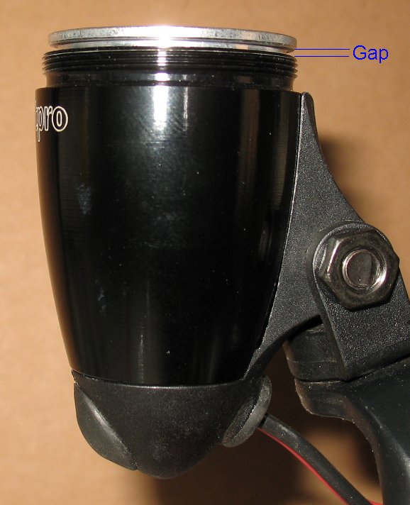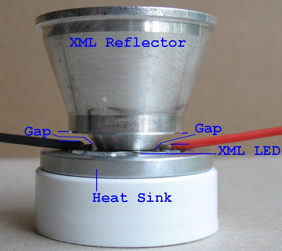 Reflector Gap Info You need to have a small gap between the reflector rim and the housing rim This gap only needs to be 1 mm or 2 mm This gap is there on purpose so that the front glass bezel can put pressure down on the whole LED stack and keep it pressed tight together. The whole stack works like this: The front glass bezel pushes down on the reflector The reflector pushes down on the LED and keeps it tight up against the big aluminum heat sink. The thermal grease carries the heat away from the LED to the heat sink and then to the outer walls of the metal housing. Things to consider if you are installing your own heat sinks. If you screw down the bezel all the way and the glass is rattling, you don't have enough gap at the top. The threads on the bezel are very deep, it will bottom out against the housing rim and will not screw down any further. Adjust the depth of your heat sink if you find that the glass is rattling. If you cannot move the heat sink I have also trimmed off some of the threads on the glass bezel so that the bezel can screw down further I have done this on a small lathe. Not the best solution, but it works |