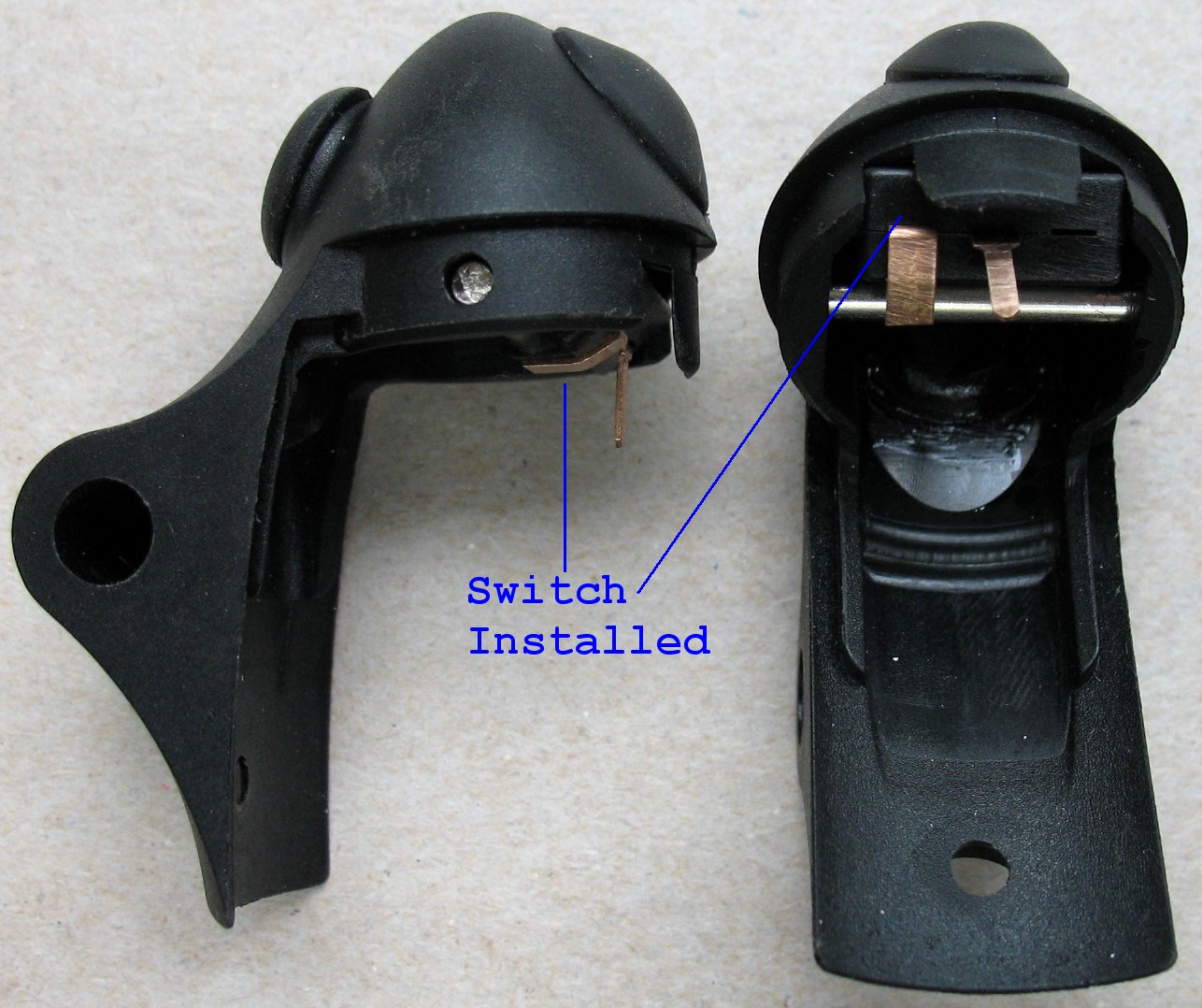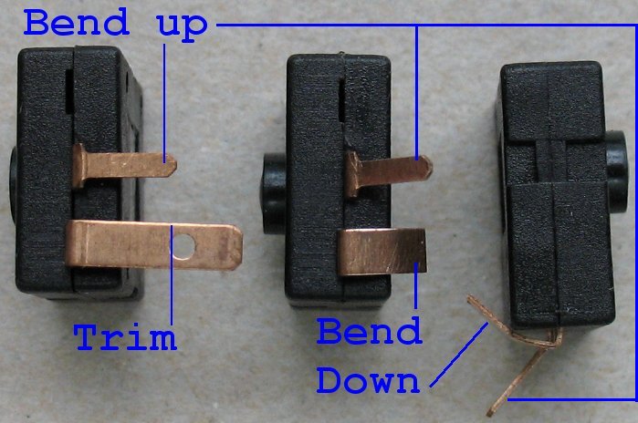 Switch prep The switch sits at an angle when mounted in the housing. The small switch contact gets bent up so that it is perpendicular to the Heat sink. You can see the bend up angle in the photos above. The large contact gets trimmed off at the hole. Bend the large contact down as shown in the photo. The large contact should not be touching the metal rod when the switch is mounted in the housing. Mount the switch in the housing and slide the metal rod over to lock the switch in place. |