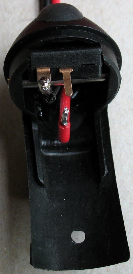 After the switch is locked in place, push the battery wire through the grommet. Solder the black wire to the large switch contact. At this point I add some glue around the grommet and wire to keep them from being pulled out of the housing I use some very thick super glue. This super glue will run out the cracks. The housing must be kept level as the glue sets up. If you can glue the pieces in place the night before you start the final assembly, that is even better. |