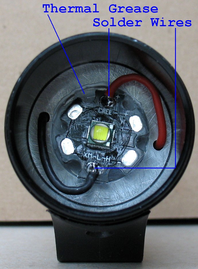 If you pressed the heat sink into the housing yourself, don't forget to drill two small wire holes. The housings I sell already have these two holes. Push the red and black wires into the two holes Slide the metal housing all the way back while pulling the wires forward. I bend the two silicon wires counter clock wise as they exit the holes in the heat sink. I do this because sometimes the LED will twist clockwise as you tighten down the front glass bezel. If the wires are run clockwise, you will be pulling on the wires. Counter clockwise gives you some slack in the wires. I use a small paint brush and add heat sink grease to the heat sink. Then drop the LED into the heat sink. This next part is difficult without a 40 watt or more soldering iron. The reason is that the LED and heat sink are able to suck the heat right out of the soldering iron tip. You need to have a large enough solder iron to avoid this. Solder the Red wire to the LED + Solder the Black wire to the LED - You must keep the solder dome as low as possible or you will short out the wires on the metal reflector. The wire tips must not reach further than the edge of the solder pads. Make sure the stripped wires are not shorting out on the aluminum disc that the LED sits on Important: See the stack height section below |