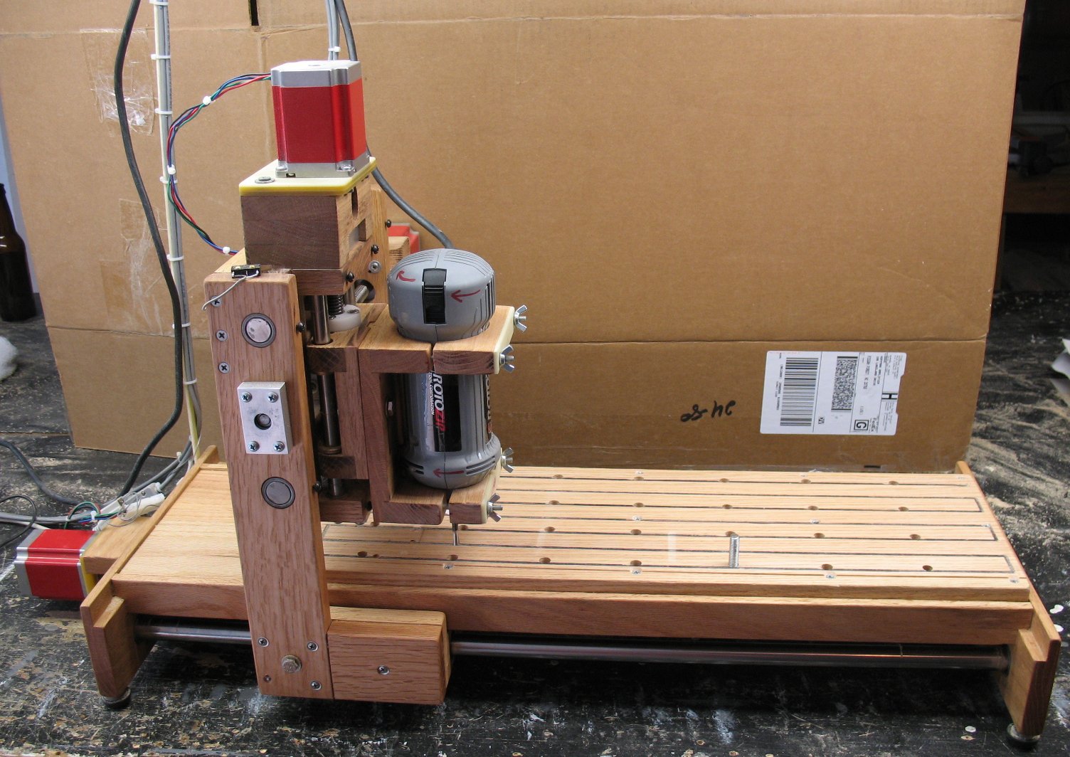 My first CNC machine I decided to build a wood CNC machine first to iron out all the design elements, see what works and what doesn't. I am using Red Oak for most of it. It's hard as rock, very stable and I had a bunch of Oak in my shop already. I didn't want to use plywood or MDF, which is basically glued sawdust. The Z and Y Axis parts The X Axis and Table Acme screws, Shafts and Bearings All the parts assembled and a working router The first project on the router and my first crash ![]() |