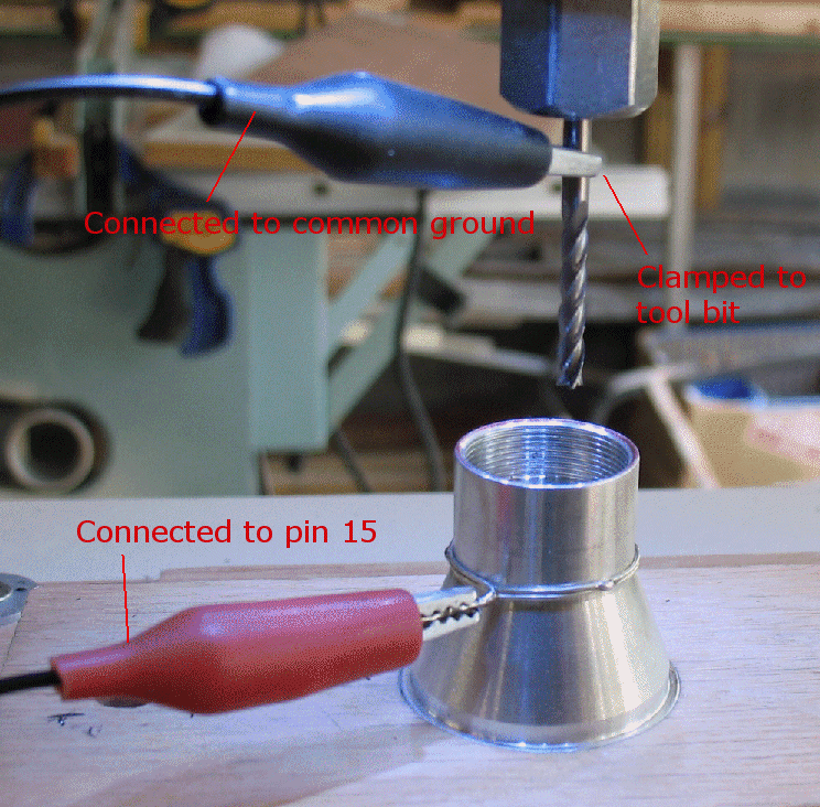 ![]() The way it works is that if pin 15 on my Probotix breakout board touches the common ground, then that is the Probe trigger. The Minus wire is connected to the common ground on my Probotix breakout board. The plus wire is connected to pin 15 on my Probotix breakout board. Each wire has an alligator clip on the business end. I clip the minus wire to my tool bit The plus wire is clipped to the metal work piece or some other piece of metal used to find an edge When the bit touches the metal work piece, pin 15 is grounded and that is the probe trigger Note that my tool is a Rotozip, which is a double insulated tool. That means that my spindle is insulated from the frame of my CNC machine and so I must also use a ground wire. If you have a spindle that is connected to the frame of your CNC, you can just use the Red wire. In that case, you would connect the common negative to the frame of your machine. Your tool bit would then be connected to the common ground and you don't need the ground wire clamped to your tool bit. |