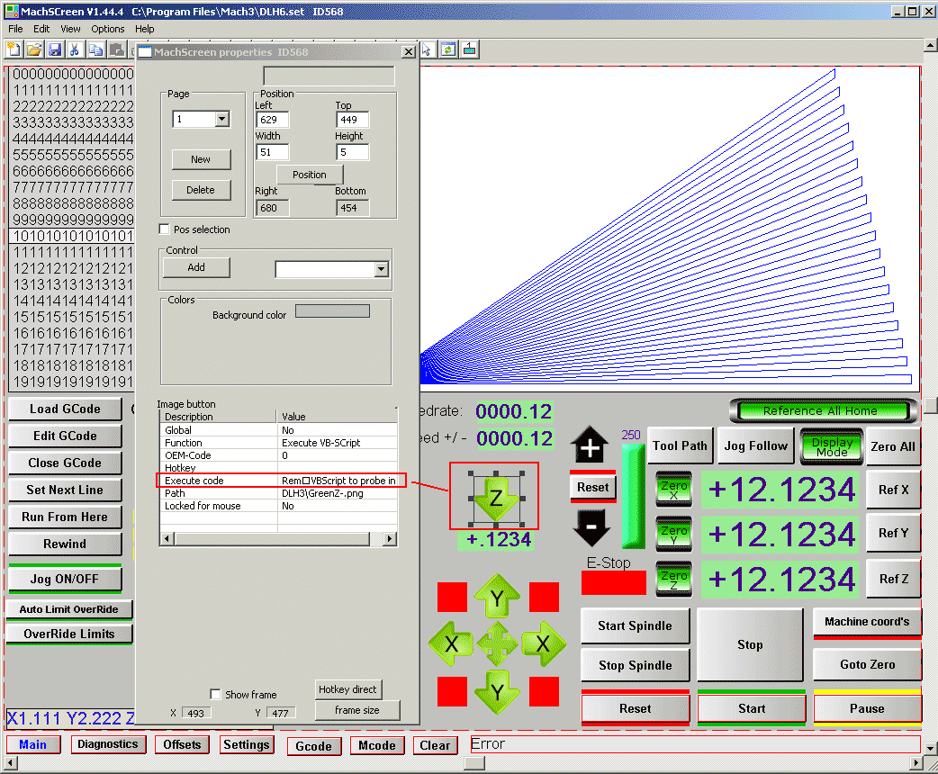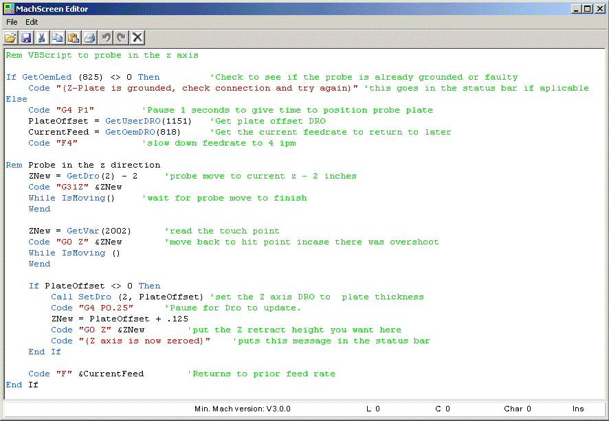 Here's an example of editing a button to run some VB script code. Note that I copied all the code from the Blue Screen example from the CNC zone post. See my link at the top of the page to the CNC zone post where you can download the Blue screen. I had to add my own buttons, LED's and graphics to my page first. My screen shot example above: Clicking on the Z down button displays all the properties of this button. Notice that the Execute code field has some text which is not quite all visible. This is the VB script code that will execute when the Z down button is pressed. Double clicking on the Execute code field opens up a text editor that displays the full script code. See the screen shot below of what the script editor screen looks like. I copied the code from the Blue screen buttons and added it to my buttons. I had two copies of the Screen editor running. One copy had the blue screen open and the other had my custom screen open. I just had to go back and forth between each screen editor to copy each button, led, etc function I wanted on my screen. You can set up all the buttons, LED's, etc by copying the properties from the Blue screen. If you are not familiar with the screen editors, I suggest you make a copy of one of your Mach3 screens and practice on it first. A screen file ends with .set and they can be found in your main Mach3 folder. |