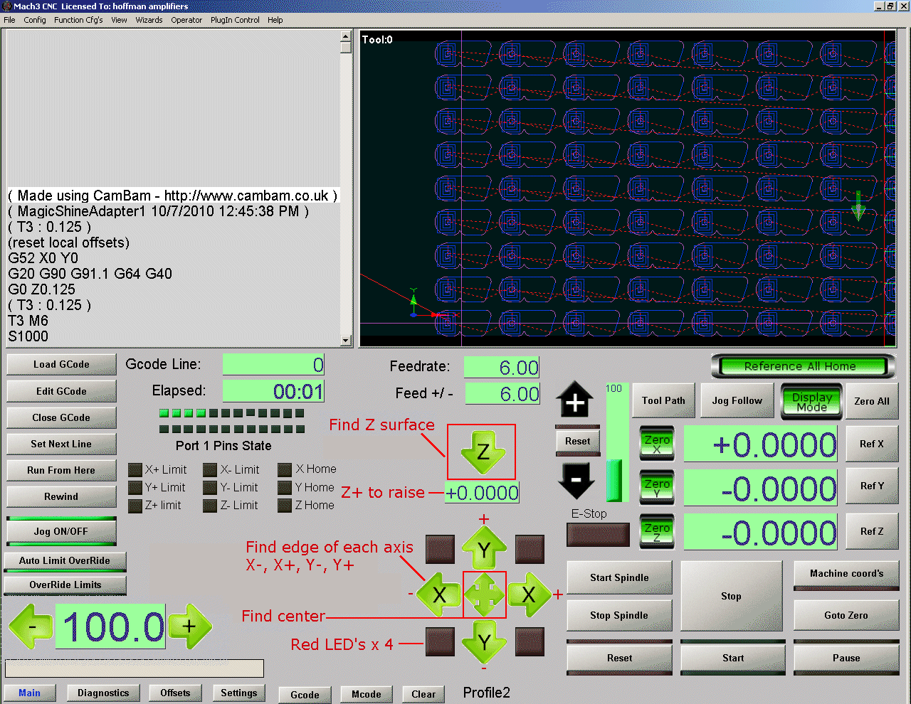 Here's a shot of my custom Mach3 screen. I created my Mach3 main screen to be very simple, no cluttered graphics and only items that I actually use all the time. I had to get rid of a few items on my custom screen that I was not using in order to make room for all the new buttons, LED's and Z+ entry field. The new items I added to my Mach3 custom screen are: Z surface Button The Z surface button is used to find the top surface of the material. The bit will slowly descend until it touches a metal surface and then it will stop. If your work piece is metal, you can go ahead and Zero out the Z axis at this point. If you use a metal plate to find the surface, the Zero Z point would actually be Z- plus the thickness of that metal plate. The green entry field below the Z surface button. After the surface is found, the bit will raise up the amount you enter in the green box. Four Axis buttons, X-, X+, Y-, Y+ Each one of these buttons will slowly move the bit until it touches a metal edge. You can then zero out that axis. If you use some other metal plate to find the edge, the thickness of that plate has to be taken into account. The four way arrow button The four way arrow button searches all four directions, Y+, Y-, X-, X+ and then goes to the center of what it finds. You can then Zero out the X and Y axis. This is the function I like best for many of the small round objects that I have to machine. Four Red LED's These led's light up when the bit touches a metal surface. |