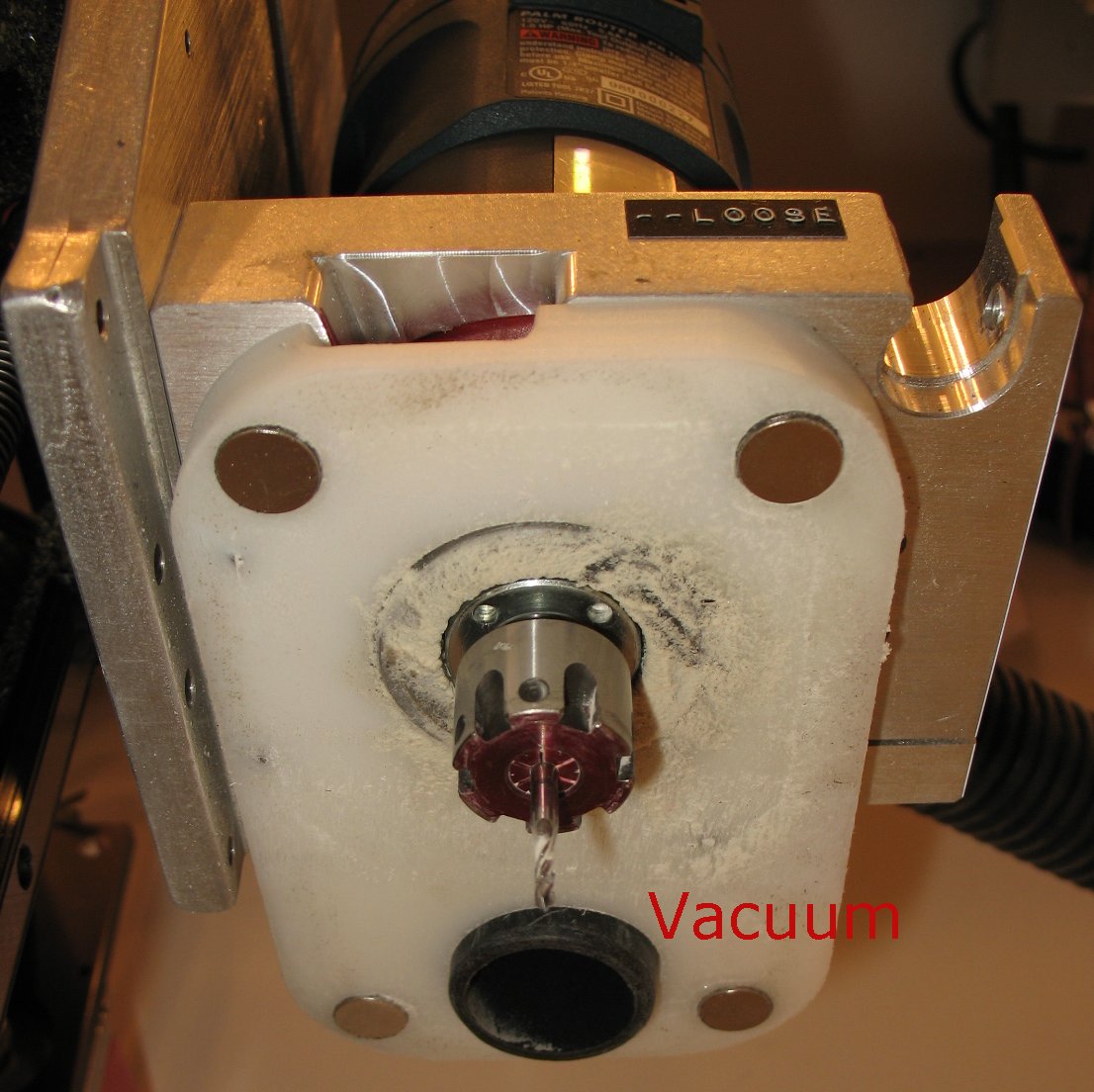 The white top and the bottom black pieces are 1/2 inch thick HDPE I machined the white top piece so that the air that blows down from the Bosch colt is channeled out the back No more air blowing down on the material and spreading crap everywhere Also, no more air blowing stuff in my face The air channels go around the outside of the router and there are two outlet ports at the back on either side of the vacuum hose The vacuum hose is not glued into the hole, you can pick it up and vacuum off the work pieces and then stick it back in the hole |