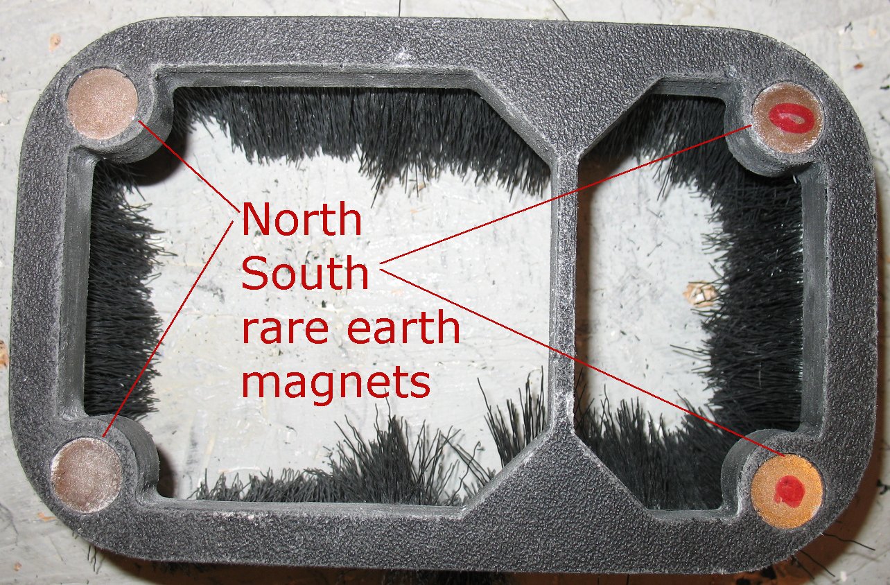 This diagram shows how the magnets North and south are different on each end of the dust shoe Also, the top set of magnets protrude out past the surface and the bottom set of magnets are recessed |