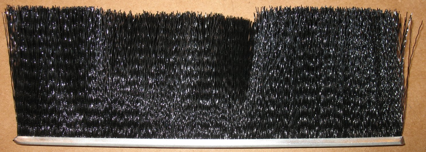 I got the conveyor brush material at Mcmaster-Carr The metal band is 1/8th inch wide x 1/8th inch tall It comes in different lengths You can get it up to 8 feet long The parts number is 74405T4 Here's the link |