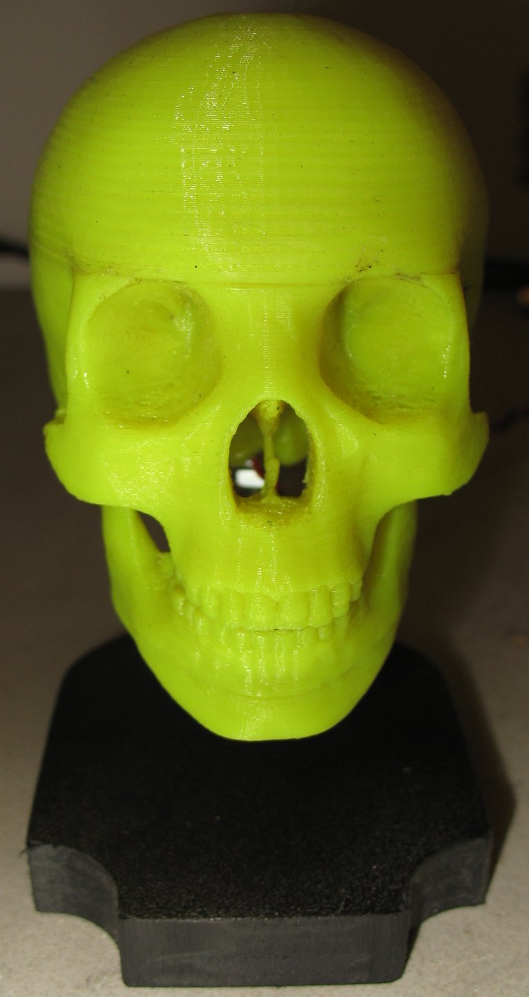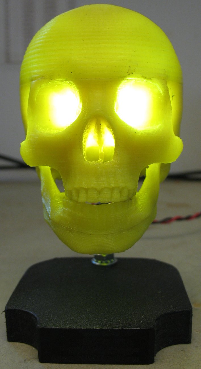 I did this skull in 4 pieces and glued the pieces together Actually the lid comes off to access some LED's and wiring that I added The line right above the eyebrows is where the lid pops off I thought about adding some evil eyeballs to the skull The yellow PLA shows off the dirt too much Maybe I'll do him in a translucent color next |