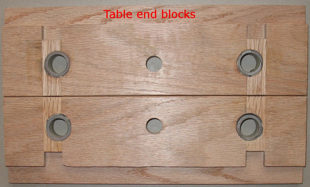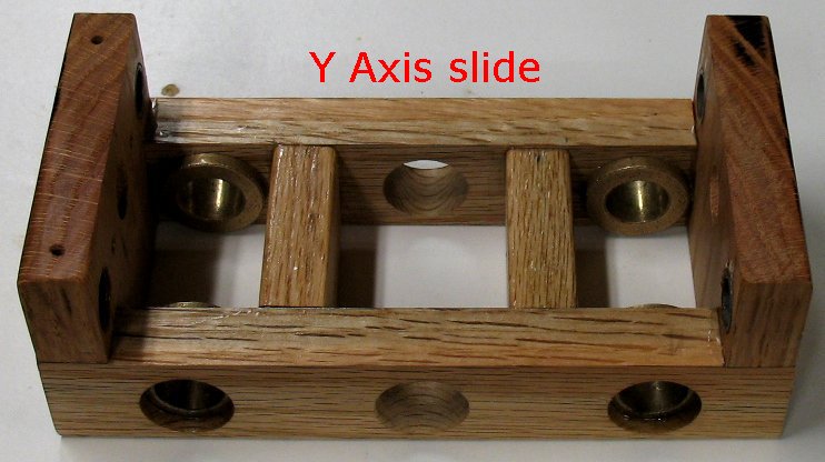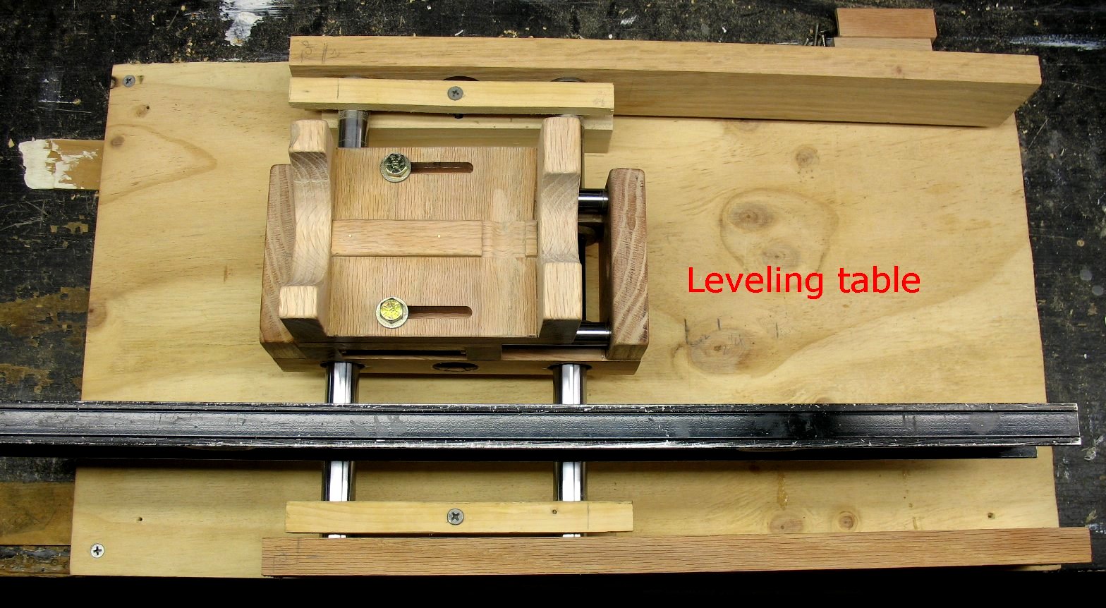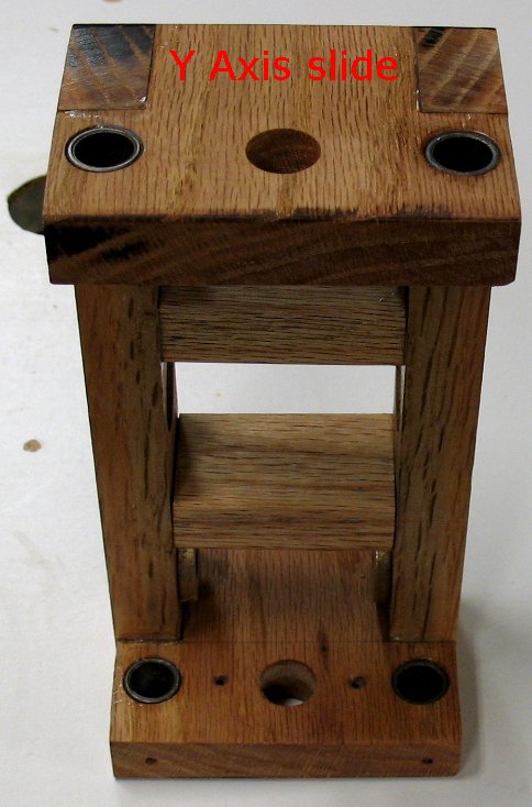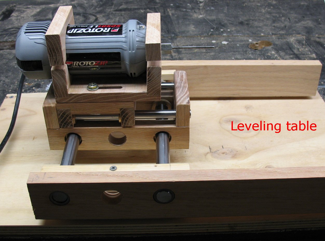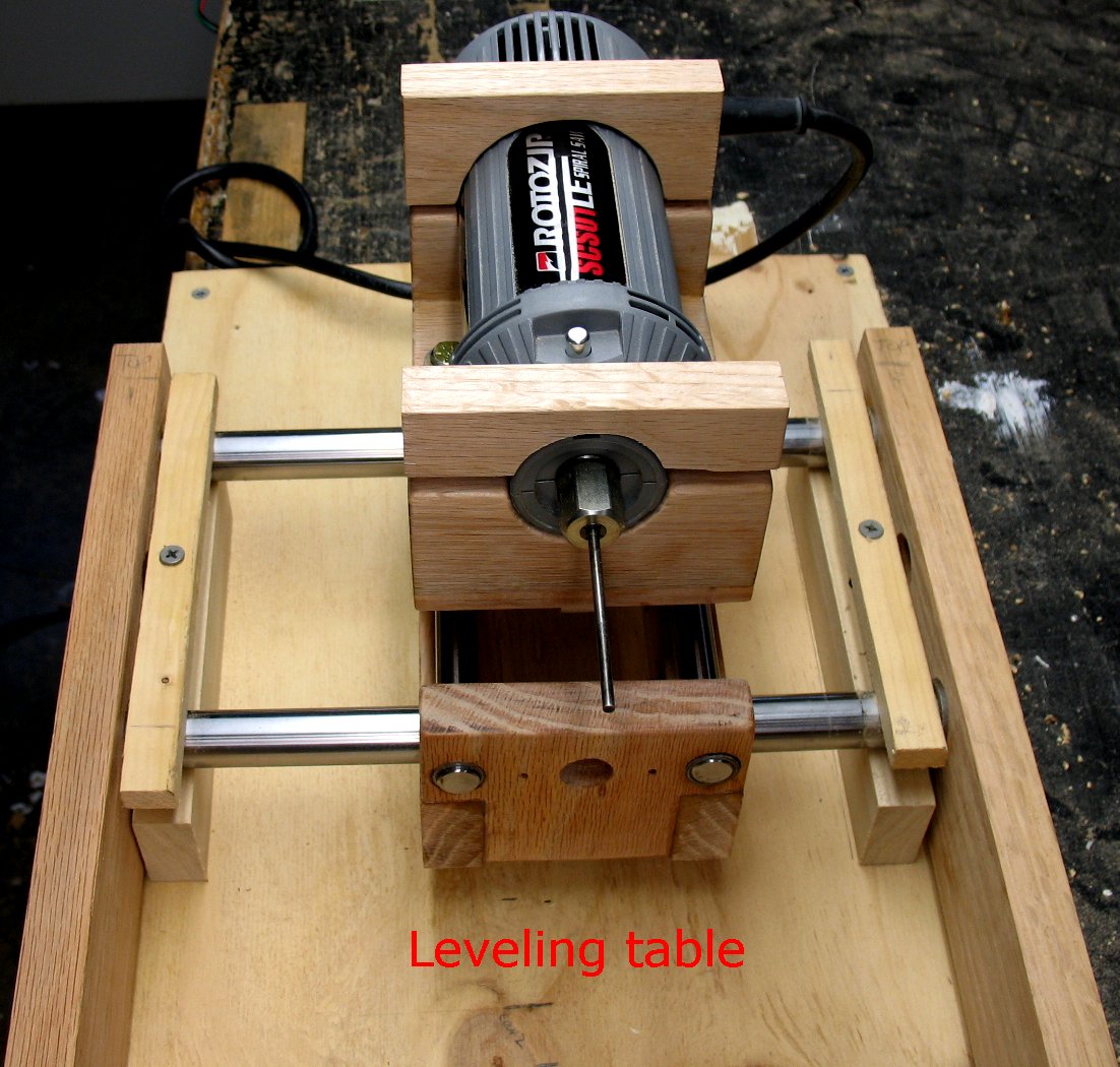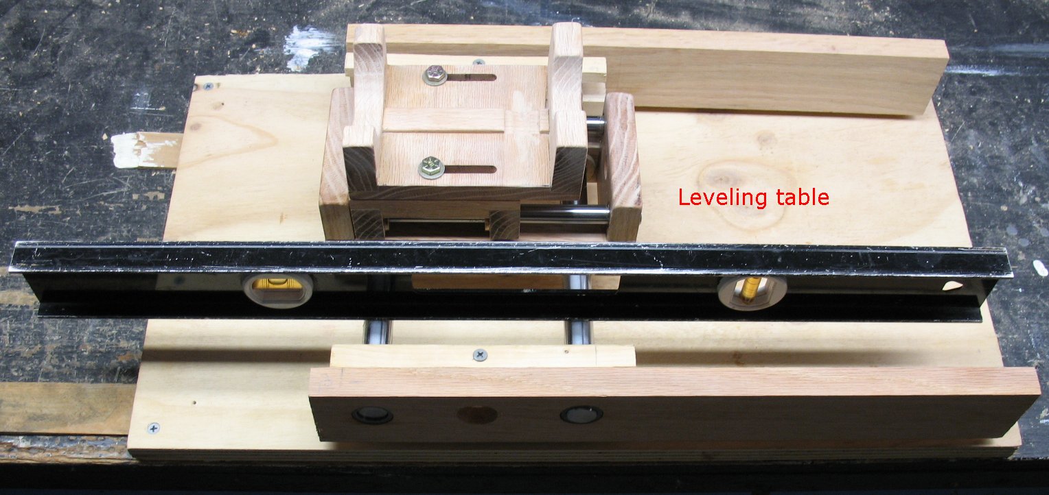 I set up a leveling table to try and get the shafts aligned as perfect as is possible when working with a wooden machine. The Y axis is locked down and then the leveling table is adjusted with shims and screws until the Y shafts are level in both directions. After the Y shafts were level I adjusted the Z axis shafts until they were level both directions. The Z shaft bearings were then epoxied into the oak. I am using bronze bearings on the ends of the shafts even though they don't turn. I will drill through the Oak, through the bearings and lock down the shafts with screws. |