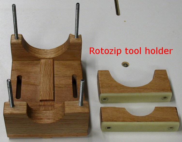 The Rotozip tool holder and clamps. Four wing nuts screw down to clamp the tool tight. |
