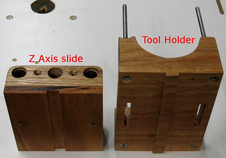 The Z Axis slide has a groove and the tool holder has a tongue. The two pieces bolt together and the tool holder can be moved up and down about 2 inches. |