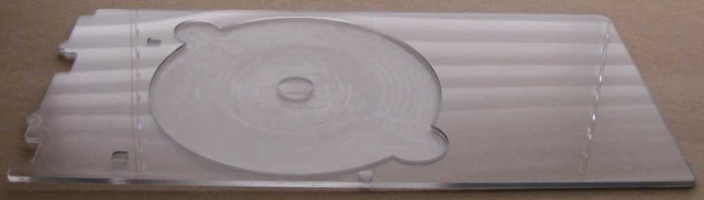 So, I am looking at the tray picture and thinking I could CNC one I took the picture of the real tray and scaled it exactly right in my image software I knew that the tray was 131mm wide x 254mm long I did not know the exact thickness and so I took a guess. I added the CD tray image to my CAD software and traced out all the areas that needed cutting I used .090 thick Lexan I machined a pocket region so the CD can sit down inside the tray In other words, the top surface of the CD is even with the top surface of the tray. Later on I found out that the CD should be slightly above the surface of the tray. I machined a couple finger holes to be able to grab the CD It's hard to tell in the picture, but the center of the CD region is still there. Sort of like a record spindle There are also a couple small squares that are cut down into the face These areas have a shiny metal foil in them. The printer looks for these areas when it is getting ready to print the CD I am going to glue a couple small pieces of tin foil into the areas The small indent on the lower edge is an alignment mark You line this up with a mark on the printer to get it in the correct spot |