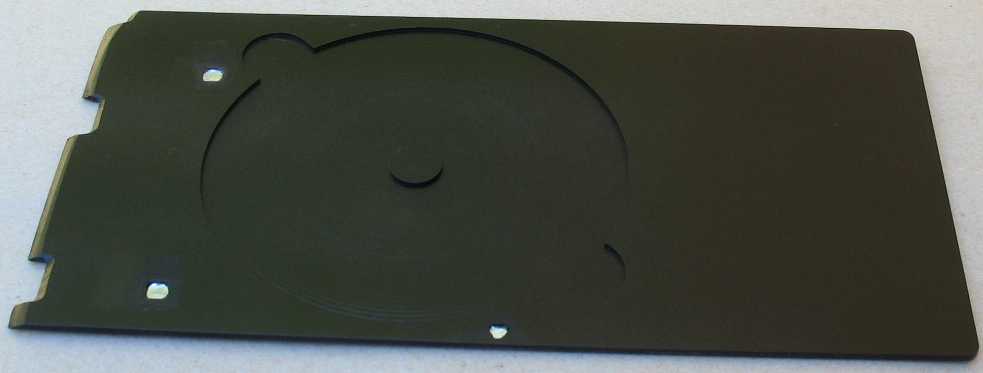 Here's the tray painted black After a few printing test I decided that the clear material was a problem The printer has a sensor that reads those two recessed shiny areas. The two depressions have some shiny bits in them so that they reflect the sensor beam back. This tells the printer that the proper tray has been inserted into the printer and it is lined up correctly for printing The printer will eject anything that is not sensed properly. The black color seemed to work better with way less ejections than the clear material I made a few other adjustments with my Dremel tool and a bench top sander. I ramped the front edge of the tray because it has to spread apart some rollers inside the printer. I had to help it along with a shove when it was not ramped. A note on the depth of the CD pocket area. I made mine so that a CD was flush with the top surface of the tray. It seems now that having the CD stick up above the top surface works better. The rollers in the printer seem to grab onto the CD surface better when it is higher than the tray surface. The under surface of the tray cannot be slick The bottom rollers in the printer needs to grab onto the tray and move it back and forth. The Lexan by itself was pretty slippery I painted the tray with some Barbeque grille paint cause that's what I had on hand It stuck to the sanded Lexan real nice and gave it more grip, with less slip. |