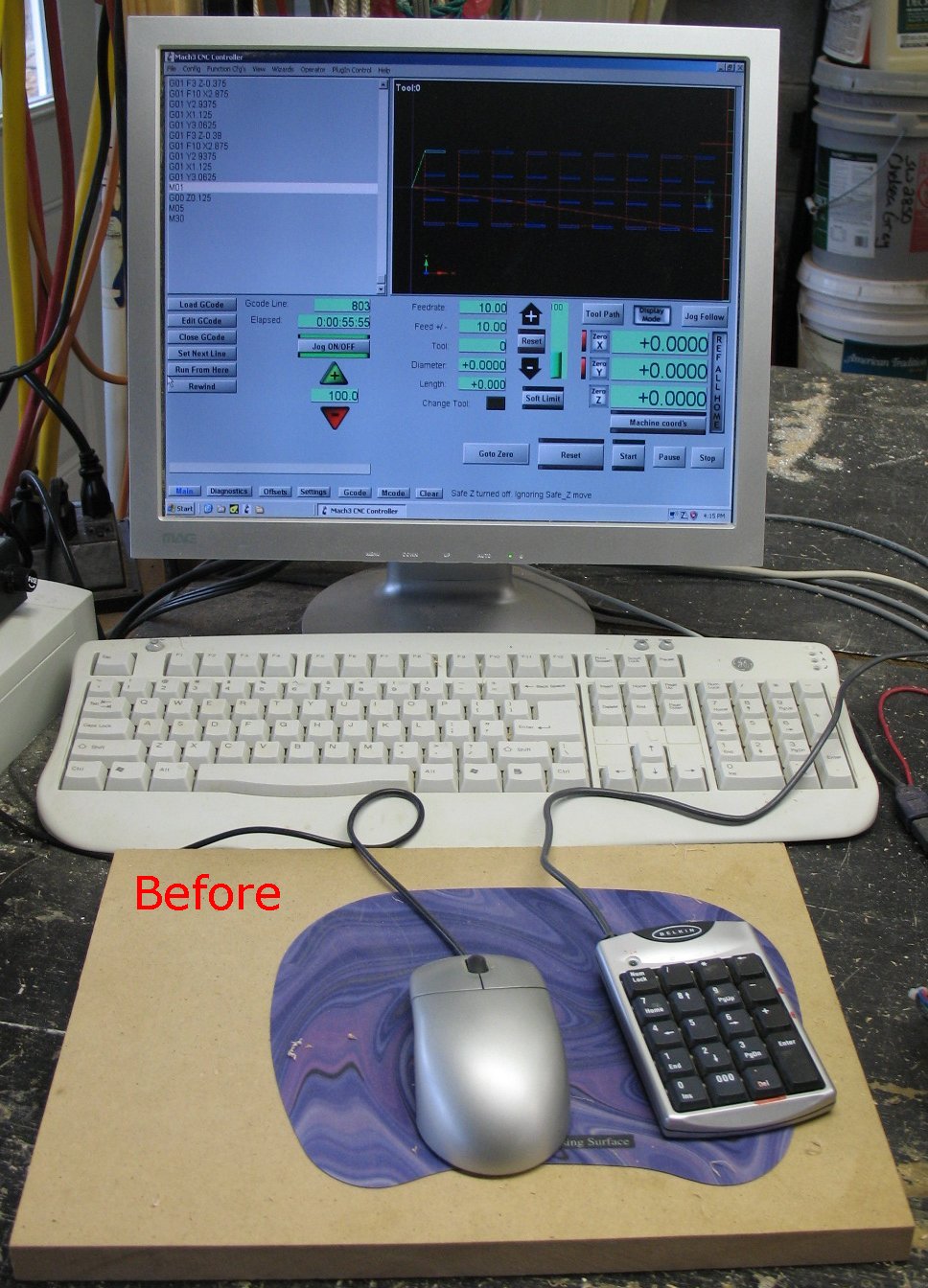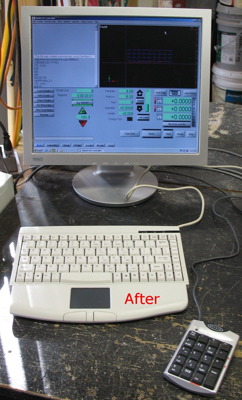 Above left: I got rid of the full sized keyboard, the mouse and the mouse pad. I only run Mach3 on this computer and I only used a few keys on the keyboard so I did not need a full sized keyboard. It was just in the way and took up too much space. The mouse was always rolling across all kinds of junk that blows off the CNC machine. An optical mouse would work better than a roller mouse. | |